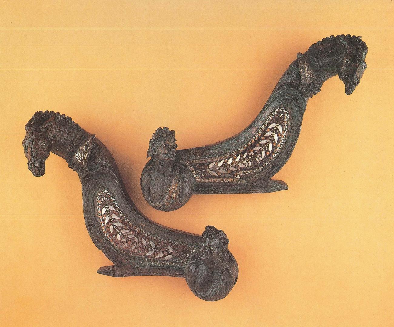 Artificially dark patinated copper alloys appear in various times and regions and are commonly applied in prestigious polychrome metallic objects. Currently, the earliest finds known are from ca. 2000 BC in Egypt (See Fig. 1) and Palestine (See Fig. 2), followed by ca. 1500 BC in Greece and Cyprus (See Fig. 3 and 4) and again during the Roman period from ca. the late 4th century BC (See Fig. 5 and 6).