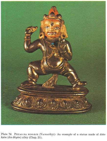 In particular, (historical) Japanese irogane alloys have achieved a great variety of colours (with several shades and complexity). Some of these copper alloys resemble the descriptions and appearance of the Tibetan dzñÄ-káčŁim alloys (See Fig. 7) and related alloys of the Himalayas (see Fig. 8) taken from Buddhist texts (Dagyap, 1977, pp.51-57). The texts describe that when these copper alloys were treated with a special solution, the colours of the rainbow would appear on the surface, an effect also visible when the material was held up in sunlight. The earliest reference to the use of these alloys is linked to a contemporary of Sakyamuni Buddha who lived in the 6th or 5th century BC (Dagyap, 1977, p.52).