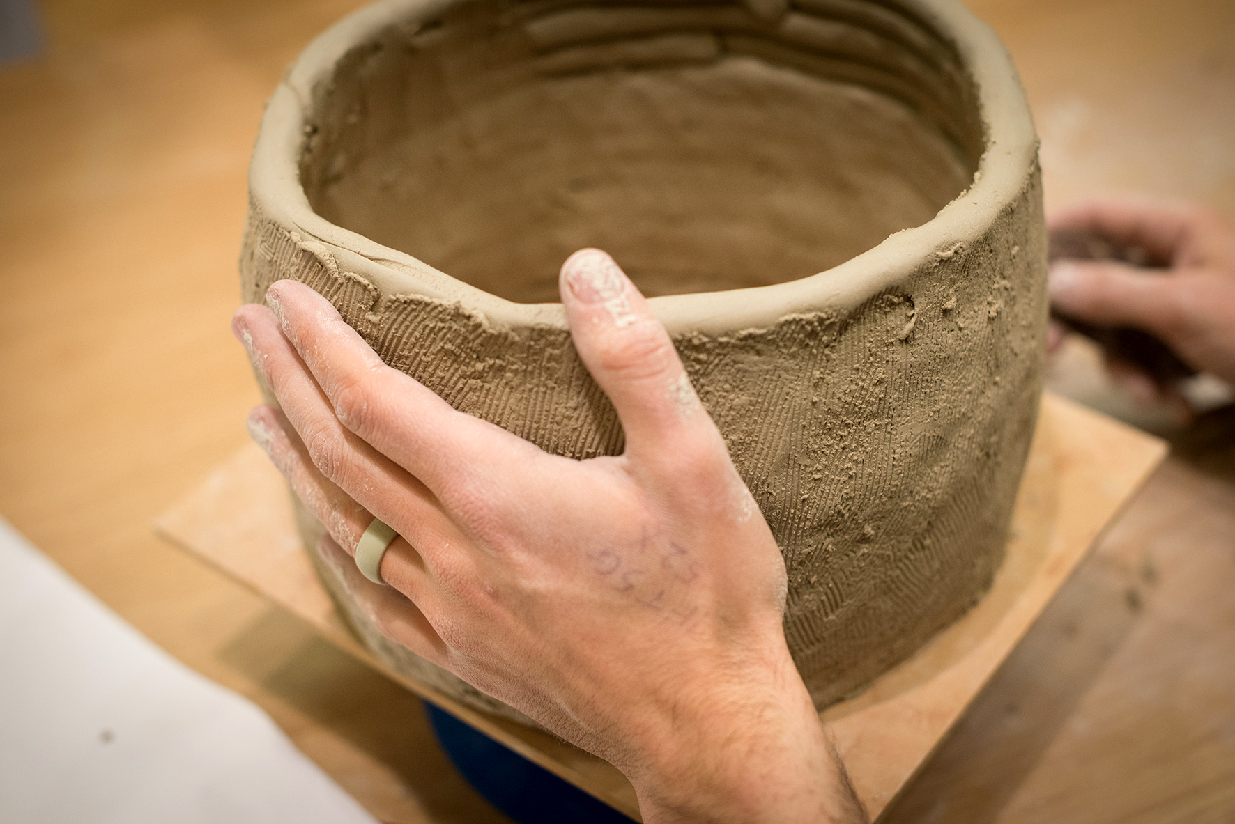 Once the internal layers of linen had been applied, individually cut strips of bias-binding and folded linen were used to create the pattern, passing around the back of the bundle and crossing at the front to form the herringbone effect. The use of authentic resin and beeswax was not permitted for the experiment as the emulsion produces noxious fumes which require an adequately ventilated workspace (usually a laboratory fume cupboard) and protective face masks. For the purposes of the live experiment, the molten resin and beeswax emulsion was substituted with a craft glue gun. For all previous experiments where the preservation of the cadaver was the research goal, the authentic resin and beeswax emulsion was used under controlled laboratory conditions. Dabs of the glue were used to secure the wrappings periodically and pins were used to fix the ends of the herringbone-forming strips until the pressure of subsequent layers was sufficient to hold them in place.