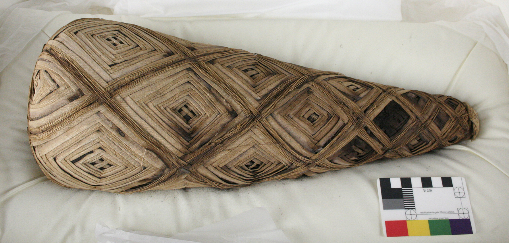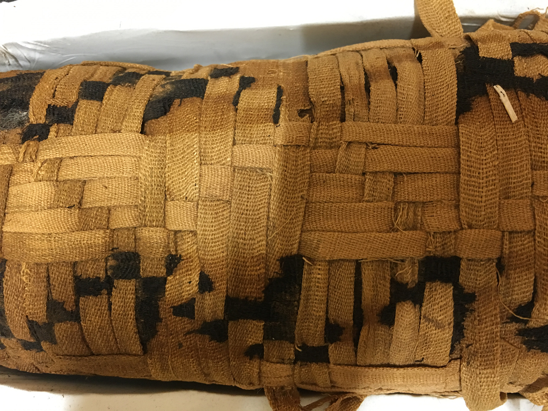 Complex herringbone, square or diamond lozenge designs have been found to cover an isolated section or completely cover the mummy bundles. It is not known whether these were produced in situ or as separate distinct pieces before being fixed to the wrapped bundle. The latter seems unlikely in the case of complete coverings where no discernible seam can be detected (See Fig. 15) suggesting that the bundle must have been supported and perhaps rotated for the duration of the activity. Further research is required to answer these questions.