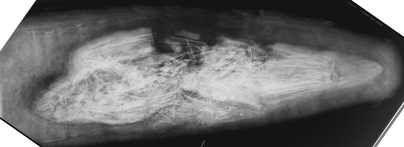 To determine the contents of the mummy and the foundation for the experiment, mummy 11501 was studied radiographically in 2014 at the Royal Manchester Children’s Hospital using digital X-ray and CT scanning1 . The investigation revealed the presence of a partially-articulated ibis skeleton with damage to the central area causing extensive disruption to the integrity of the underlying skeleton (See Fig. 5). An air void caused by the settling of the disturbed contents was visible, and although the outer linen layers survive intact, there was evidence of bundle mobility manifesting as a slight ‘spongey’ texture.