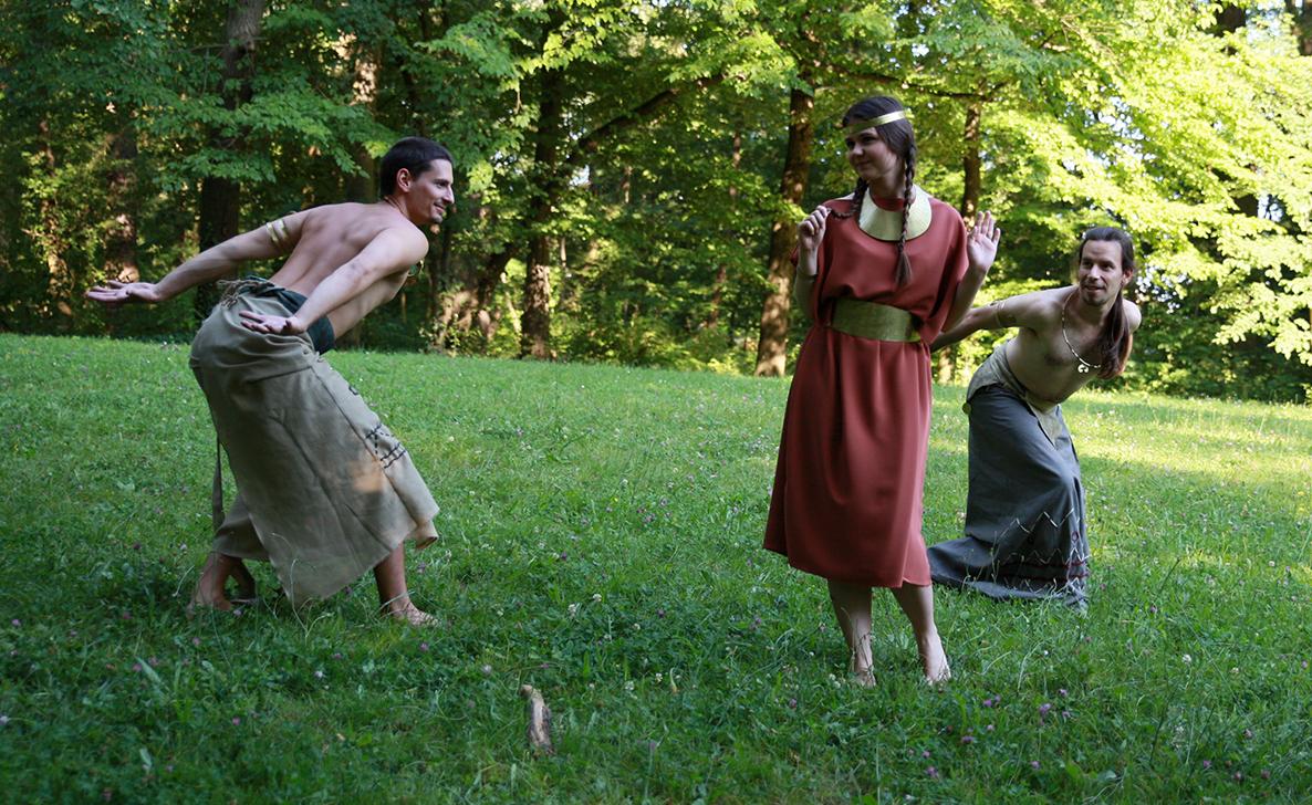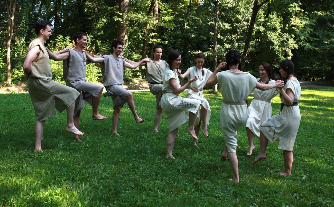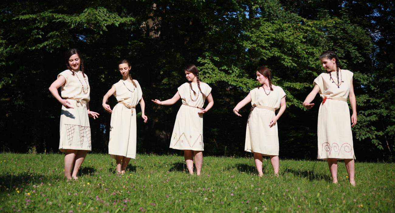 In order to find the musical background, the available sources were studied and a newly composed music with characteristics that approximately corresponded to our knowledge about the music of Neolithic, Chalcolitic, and Bronze Age societies was used. The clothing of the dancers was made based on the basic notions about the clothes of communities from Neolithic, Chalcolithic and Bronze Age periods and it was decorated with characteristic motifs of particular cultures (Neolithic Sopot culture and Chalcolithic Vučedol culture) that were recorded on ceramic vessels and figures (See for more http://cexa-zg.org/costumes.html). Various pieces of jewellery were made as direct replicas of existing artefacts. The performers were solely amateur dancers with varying degrees of various dance knowledge and degrees of skill, which provided an unexpected touch of authenticity to the final result.1