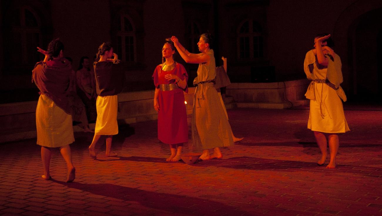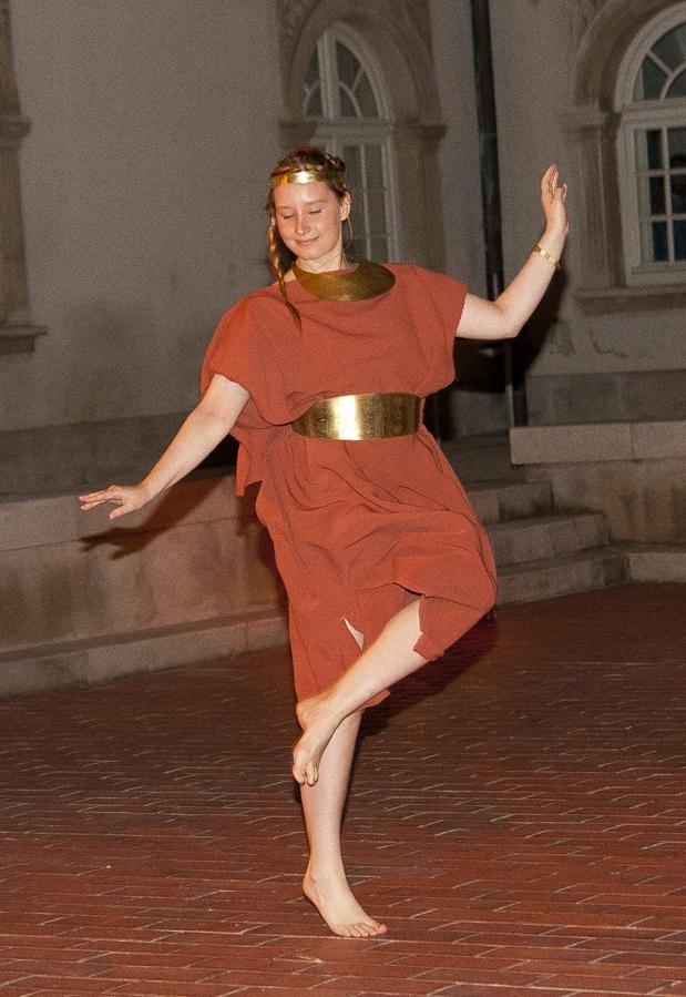 Finally, the third stage was the presentation to the public. Since the initial idea was not only to entertain with a mere dance show but also to educate about the role and nature of dance in early societies as well as about the more or less local archaeological heritage, for each choreography there was a short spoken introduction, accompanied by images, about the time period and the type of dance that follows.