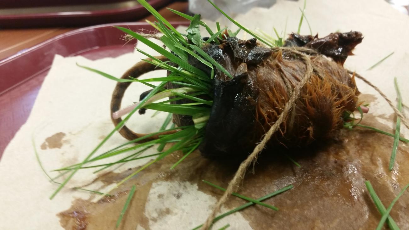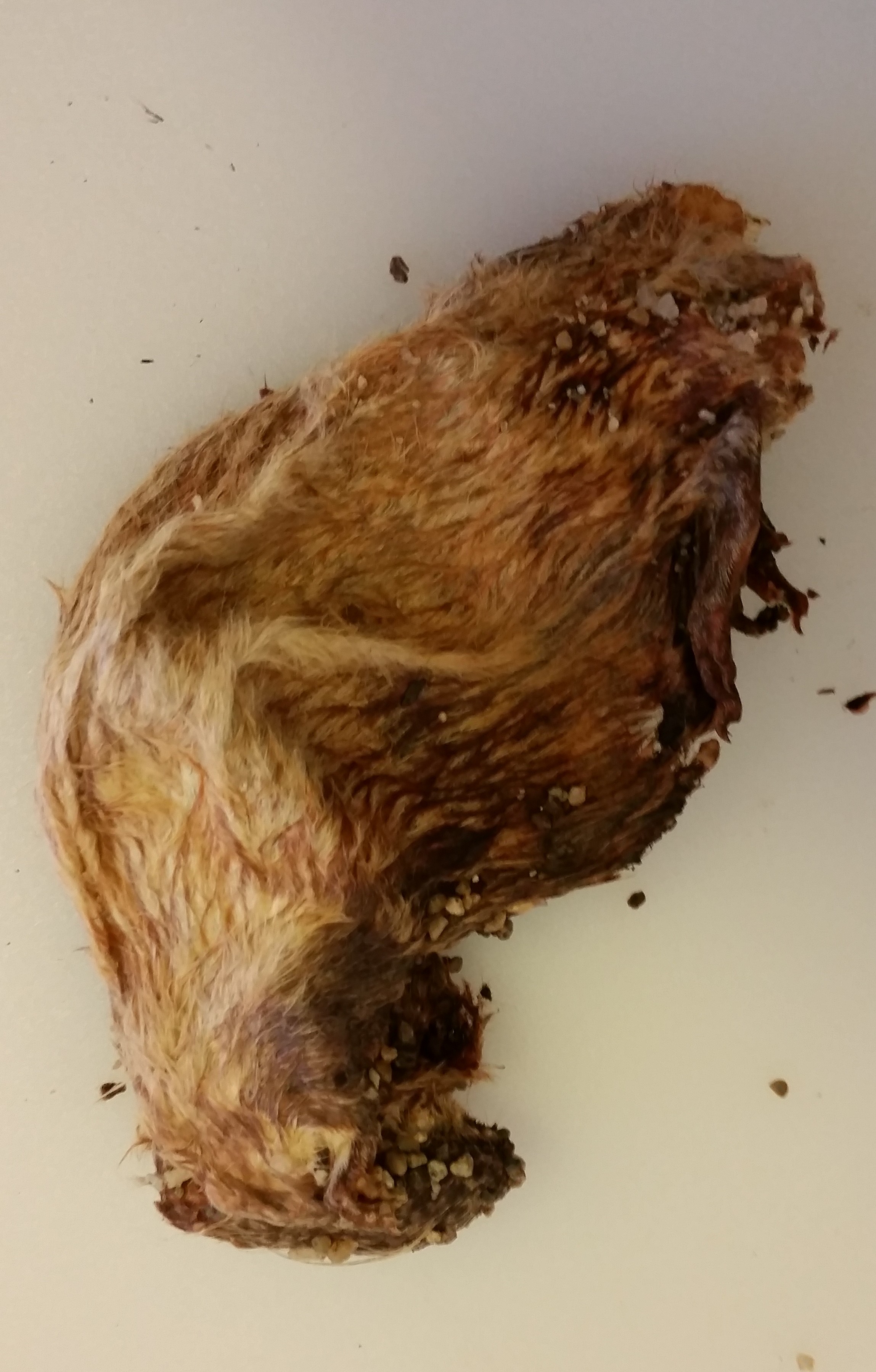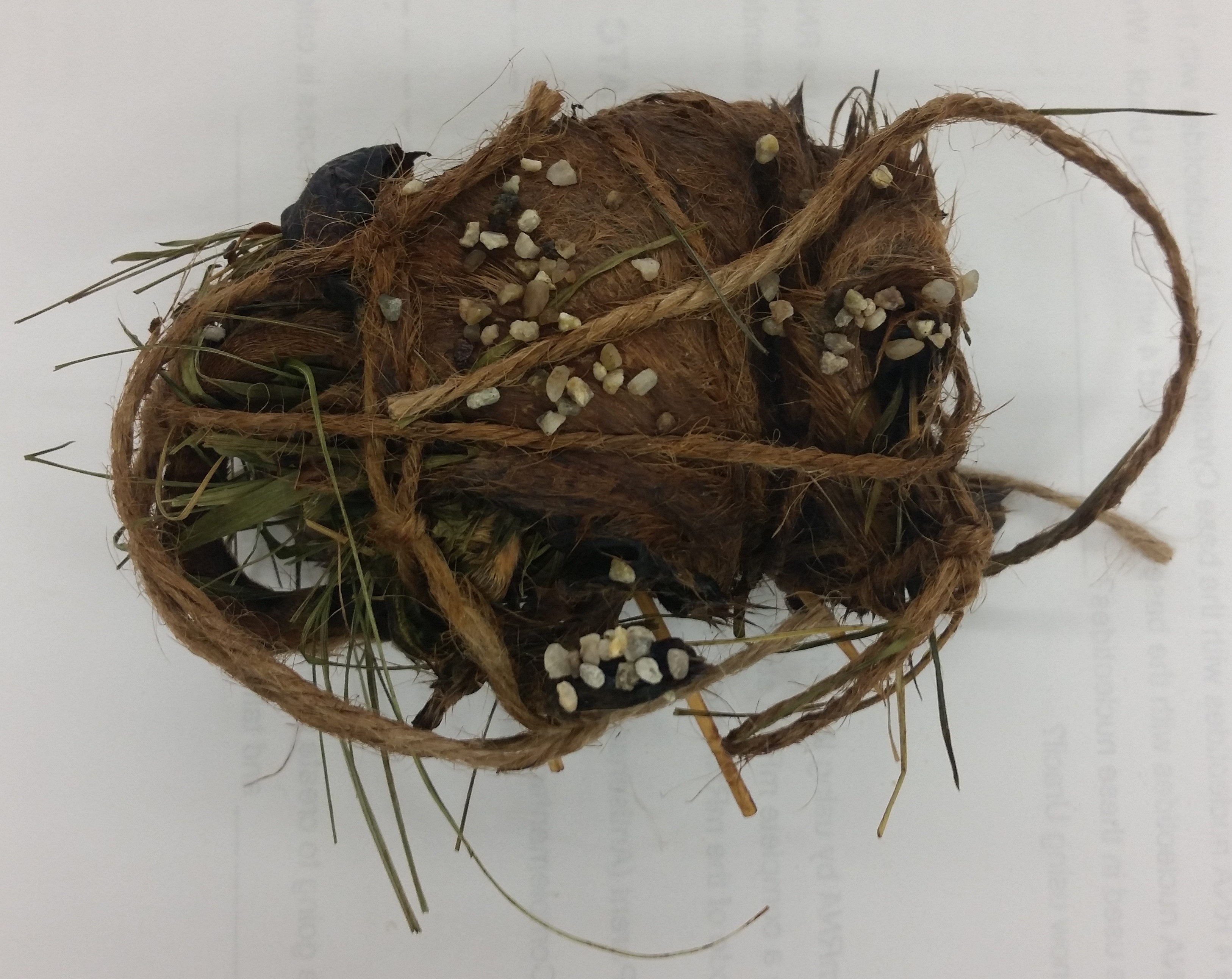 To begin the ‘Black Technique,’ the rat was washed in saltwater, eviscerated and skinned but not dismembered. The choice was made not to dry the skin or removed flesh in hot ashes or coals, as the Inca would have done because we did not believe it would impact the overall desiccation process significantly. Drying of the skin and flesh in coals could easily be done in future applications of the protocols developed from this project. The rat carcass was washed in Chicha corn beer which was homemade for this project. Inca skin would have been set aside and stuffed with vegetable matter and animal hair. The rat carcass was stuffed with vegetable matter, specifically grass (See Figure 9). As the skeletons of the Incan deceased were often reinforced with sticks, this was attempted with the rat carcass by reinforcing its body with toothpicks. The Inca often made mummy bundles in which the deceased would be placed in a fetal position and wrapped into bundles using textiles. The rat in this study was not wrapped in textiles, but it was placed in the fetal position. The rat mummy bundle was bound together with twine (See Figure 10). Clay masks and wigs were sometimes placed on the body by the Inca (Rosso, 2014). In future uses of these protocols it would be easy to coat the outer surfaces of the specimen’s face with white ash paste or clay to model the ritual of the clay mask.