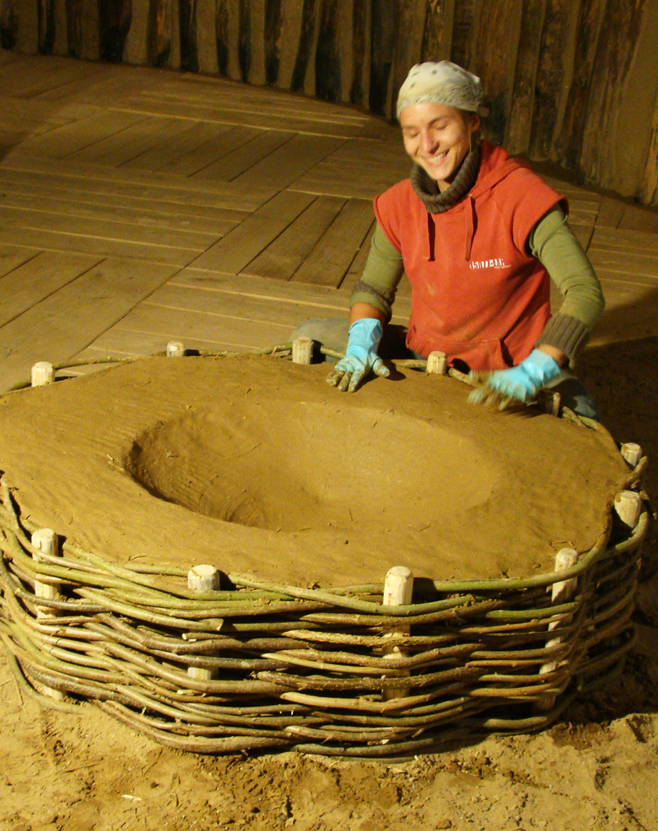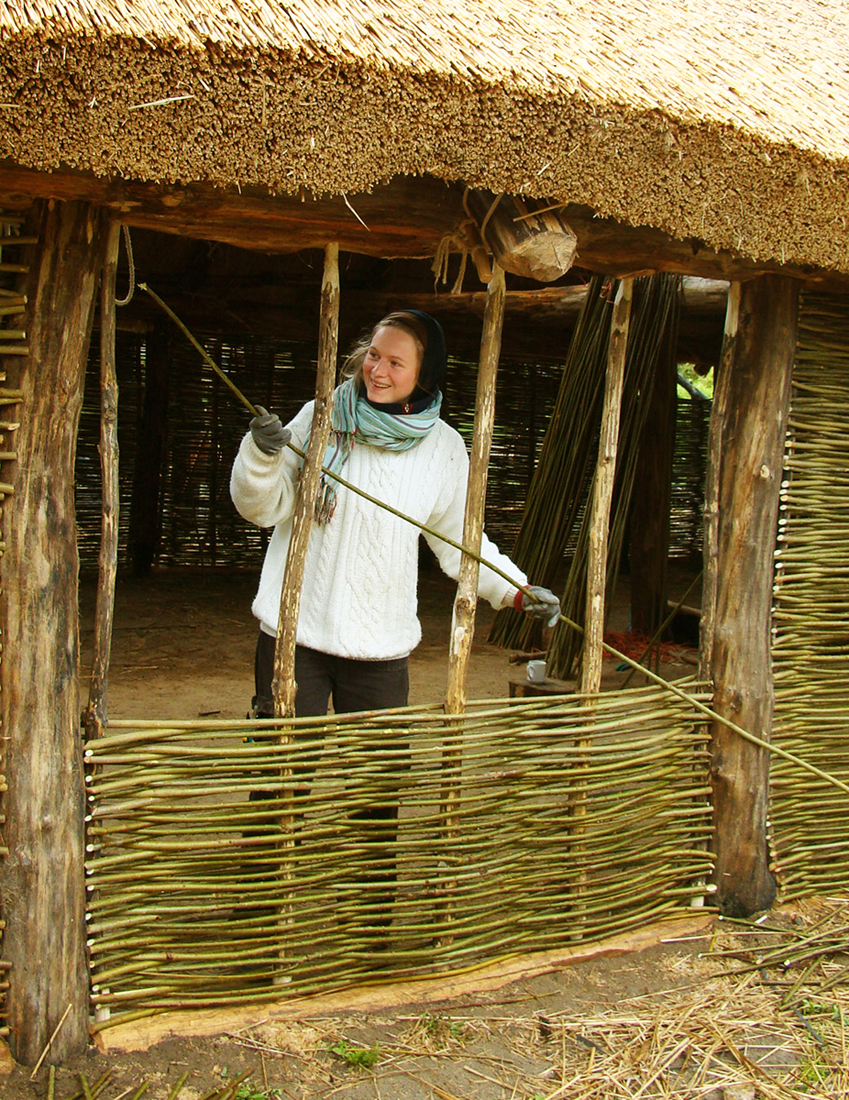 We built the walls up to 2 m high and therefore the new model was completely different in appearance from the old models, where the roofs are nearly touching the soil. The idea was that with higher walls one can use the inner parts of the house much better and it also helps to keep the walls dryer. Concerning the wall construction, we had some evidence of posts which were situated very close to each other in the western part of the archaeological house. Therefore, we constructed the wall like a palisade with the gaps in between filled with clay. To join the vertical wall logs to the roof plates we fixed them with oblique wooden pegs. The holes for the pegs were worked out with a small bronze chisel. The pegs were split out of straight grown oak and carved with bronze knives. Where there was no direct archaeological evidence we constructed the walls in two other variations. We interpreted the common function of the foundation trenches as drainage for rain water. The amount of water coming down to the eaves from a roof which is bigger than 300 mÂČ during a thunderstorm or while thawing is enormous and people in the Bronze Age surely had to protect the inside of the house from this flood. For this reason, we embedded horizontal beams into all the other wall trenches and they have been a perfect barrier against surface water. In the middle of the house and in the eastern gable we used wattle and daub for the superstructure. The vertical sticks of these walls were pushed into holes on the upper sides of the buried planks, which prevents the loam plaster from soaking up water from the soil. The vertical sticks beside the posts were additionally mounted with little wooden pegs. The peg holes were made using a bow drill with a bronze point, which we formed after an ethnological model from Morocco. Homer mentions a bow drill in his Odyssey and we assumed that the drills in the Bronze Age were constructed that way (Odyssey, 9.384). The infills of the walls were woven with willow rods. With regards to the loam plaster, we got the opportunity to use different compositions of clay and organic material and different techniques of bringing up the loam render to the walls. The walls of the smaller room at the eastern part of the house were made with horizontal laid split planks of oak. To fix those planks we carved vertical grooves on the sides of the earth-fast wall posts using bronze chisels, and thus the planks could be inserted with their conical ends. To smoothen the edges and to fit the planks together our drawing knife of bronze was very helpful (Speck, 1989). The gaps in between were filled with clay (See Figures 11 and 12).