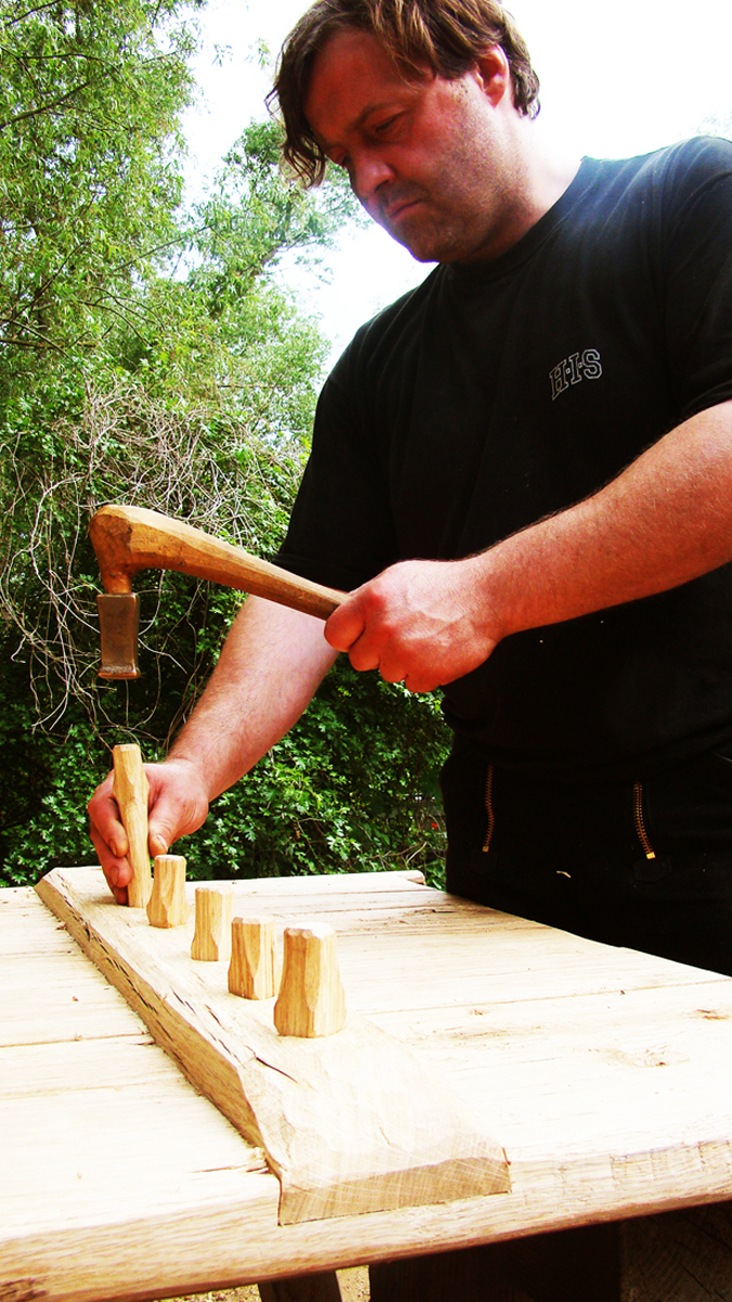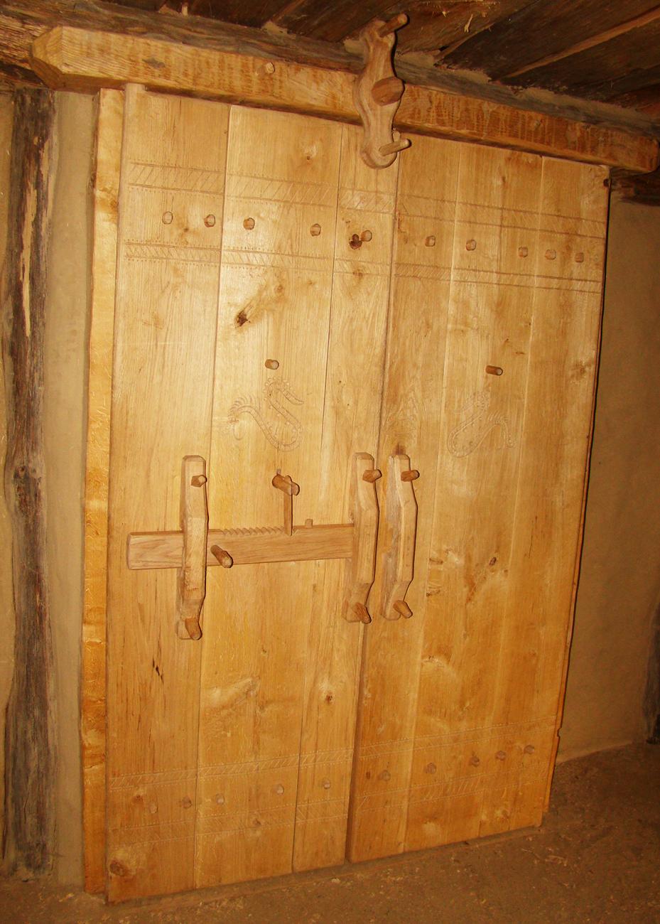 The doors were fixed in separate door frames similar to the ones known by ethnological parallels from Mongolian tents (RonĂĄ-Tas, 1989). We think that these door frames bring advantages pertaining to common stability and place management. With the additional frames the doors can be opened up to 180 degrees towards the inner side of the house. The frames are independent from the house construction and can therefore easily be taken out for possible repair work in the future. We built the door frames out of quartered timbers. The construction elements were smoothed with bronze adzes and stuck together with mortice and tenon joints additionally fixed with wooden pegs. In total, we built five doors: two normal ones, two double leaf doors and one so called âKlöndörâ; where two door leaves are mounted one over the other and can be moved independently. The planks were radially split from straight grown oak. Afterwards the raw pieces, with a triangular cross-section, were formed into rectangular boards using bronze adzes. To avoid warps we used levelling laths to mark straight forms. It was a full one-day work for one person to hew such a board. Here we also conducted an experiment - to shaft a small bronze blade like a plane, and this resulted in smooth wooden surfaces. Of course, we cannot prove that planes were common tools at that time, but from a technological viewpoint it would have been possible. The prepared boards were connected with conical planks of trapezoidal cross-sections, which were inserted crosswise in well matched grooves and fixed with wooden pegs. To join the edges of the boards we used different techniques like oblique gaps, tongue and groove connections, or rebates. There is good archaeological evidence for rebates from a Bronze Age cistern in Switzerland (Rageth, 1985). The finished door leaves can be moved over round pivots on their corners, which are guided by round holes in the heads and the sills of the door frames. Each door may be locked with different variations of wooden bolt mechanisms (See Figures 13 and 14).