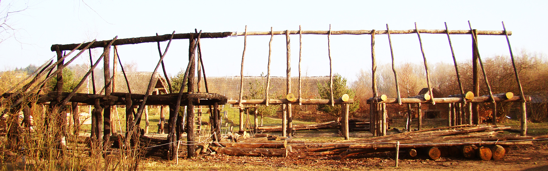 For the building wood to be used in our new model, we tried to find wood species that might have been used during the Bronze Age. Local evidence indicated the use of alder from Rodenkirchen, which is surrounded by alder-ash dominated wetland forests. But is alder an ideal wood for use in construction? Considering that people in Bronze Age, like museum chiefs today, desired long lasting houses, we assume that, if available, people used oak especially for the construction of earth-fast posts. There was oak in the Bronze Age forests near Hitzacker. Oak has a very high concentration of tanning acids and is therefore more resistant against wood pests of all kind than other tree species. This effect is even stronger when the trunks are cut down in winter time, and when the sapwood of the under parts of the posts is removed and the surface becomes hardened by fire. Due to these findings we constructed the new house model in Hitzacker using mostly oak wood. According to archaeobotanic data there were nearly no conifer tree species in the forests at that time, except some occasional pines (Lesemann,1969). Therefore, we used ash wood in the construction of the roof truss (See Figure 4).