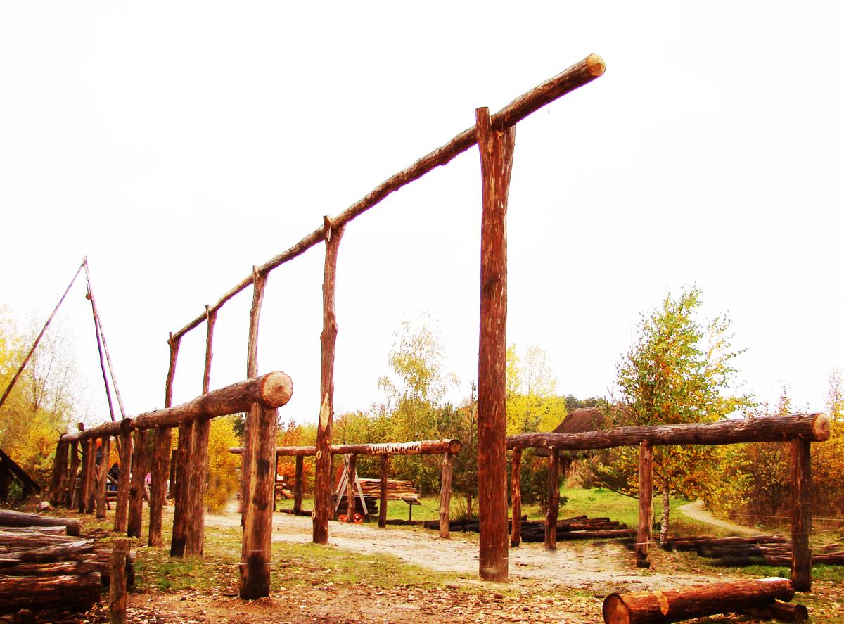 The five earthfast ridge posts of the axial centre line had diameters up to 35 cm, were about 7 m long and showed natural grown forks at their tap ends. With bronze blades the forked ends were worked over to a round form matching the diameters of the ridge purlins. The blades, which turned out to be well suited for this purpose, were hafted as axes in knee-grown handles. At their butt ends the trunks were barked and hardened in fire. How could people in former times accomplish the erection of the heavy trunks of up to 600 kg or more? We assume, that they might have had some kind of a simple hoist. On our building site we used a moveable three-leg-hoist, built of 8 m long stems that were bound together at their tops. A deflection roller coupled with a strong rope which was guided helped us to pull the forked ends of the posts upwards. For security reasons we used a metal rope. But there is archaeological evidence for a strong load rope with a diameter of about 4 cm found in the Bronze Age salt mines in Hallstatt in Austria (Löcker and Reschreiter, 1998). Concerning the deflection roller, we have archaeological evidence from an Iron Age site in Fellbach-Schmiden, where a wooden object was found, that could have been used in a similar way (Plank,1985) (See Figure 6).