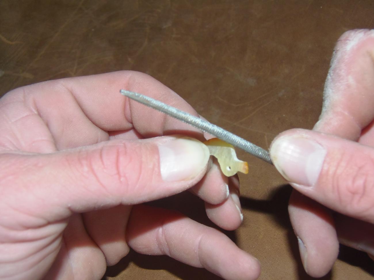 Following this I retrieved the long bone from a cow’s leg, I cut it obtaining a rectangle and furthermore split this rectangle into two smaller ones. These were going to substitute for the ivory plates, ivory trading or working is illegal in Italy. Once I had the bone plates refined to match the lower bronze ones, I drilled a total of four holes on each of them, of which two holes were going to host the amber nails keeping the ducks in position, and the other two were needed for the bronze nails fixing each couple of plates to their lower bronze ones. For the cutting and drilling I used a hacksaw, a hand drill and some files. According to Dr. Giuliano De Marinis's analysis (de Marinis, 2001, pp. 46-47) on some horn handles found in Moscosi di Cingoli, a site situated 30 kilometers far from Matelica, by the beginning of the Iron Age both hand drills and hacksaws were used. The use of files is conceivable by the traces these tools may have left on some blades, such as the bronze knife dating to the 9th century found in Sirolo. Moreover, the use of whetstones for polishing or grinding is attested by one of these tools, also found in Sirolo (Landolfi, 2001).