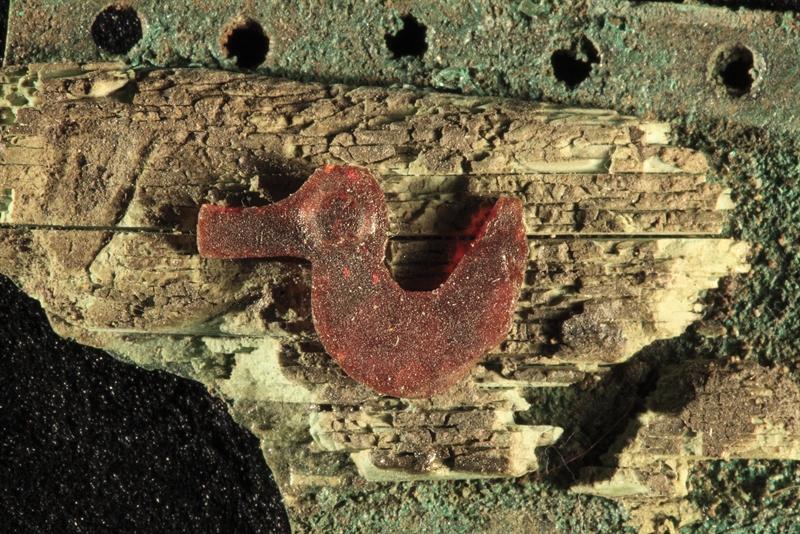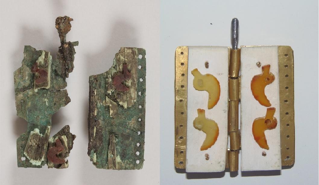 The clasp itself is basically a hinge composed of two halves rotating around a vertical iron pin. Each of the halves is composed of a bronze plate on which an ivory one is nailed. Two tiny amber figurines cut into the shape of decorative ducks are also fixed on each ivory plate. They are held in position by microscopic nails also made of amber and inserted through small holes drilled on each duck’s head.