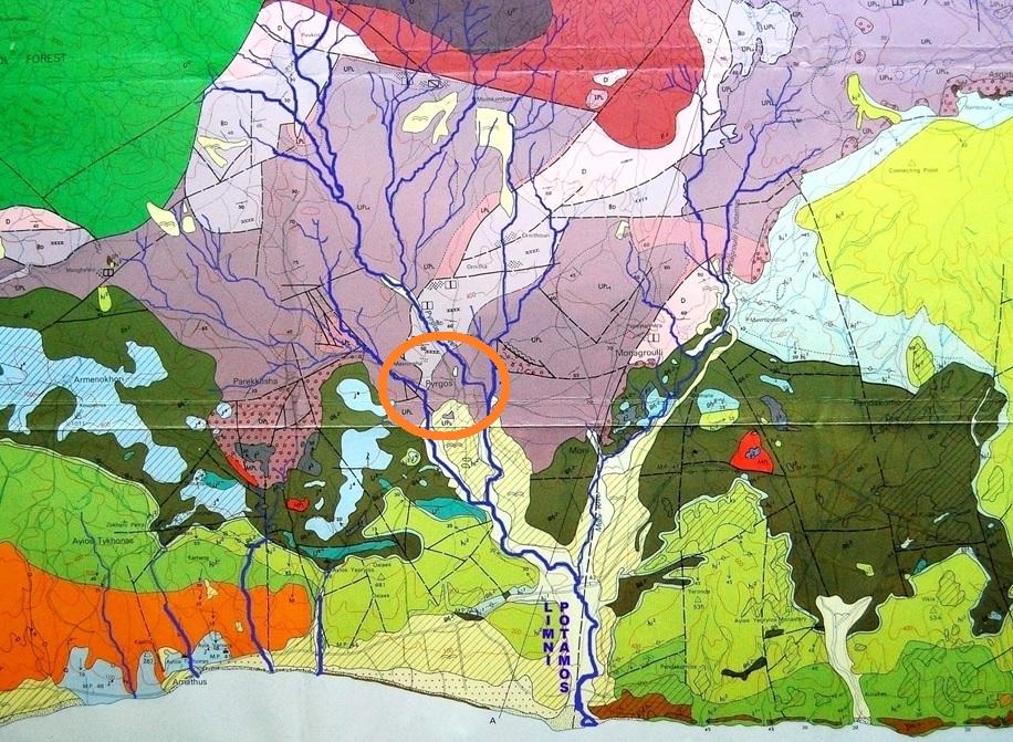 The geological map of the area shows clearly the position of Pyrgos on the copper ores deposits (in purple) (See Figure 1). The most important ore formations nearby the site are Pevkos, Mazokambos and, further to the East, Kalavasos (Bear, 1963)