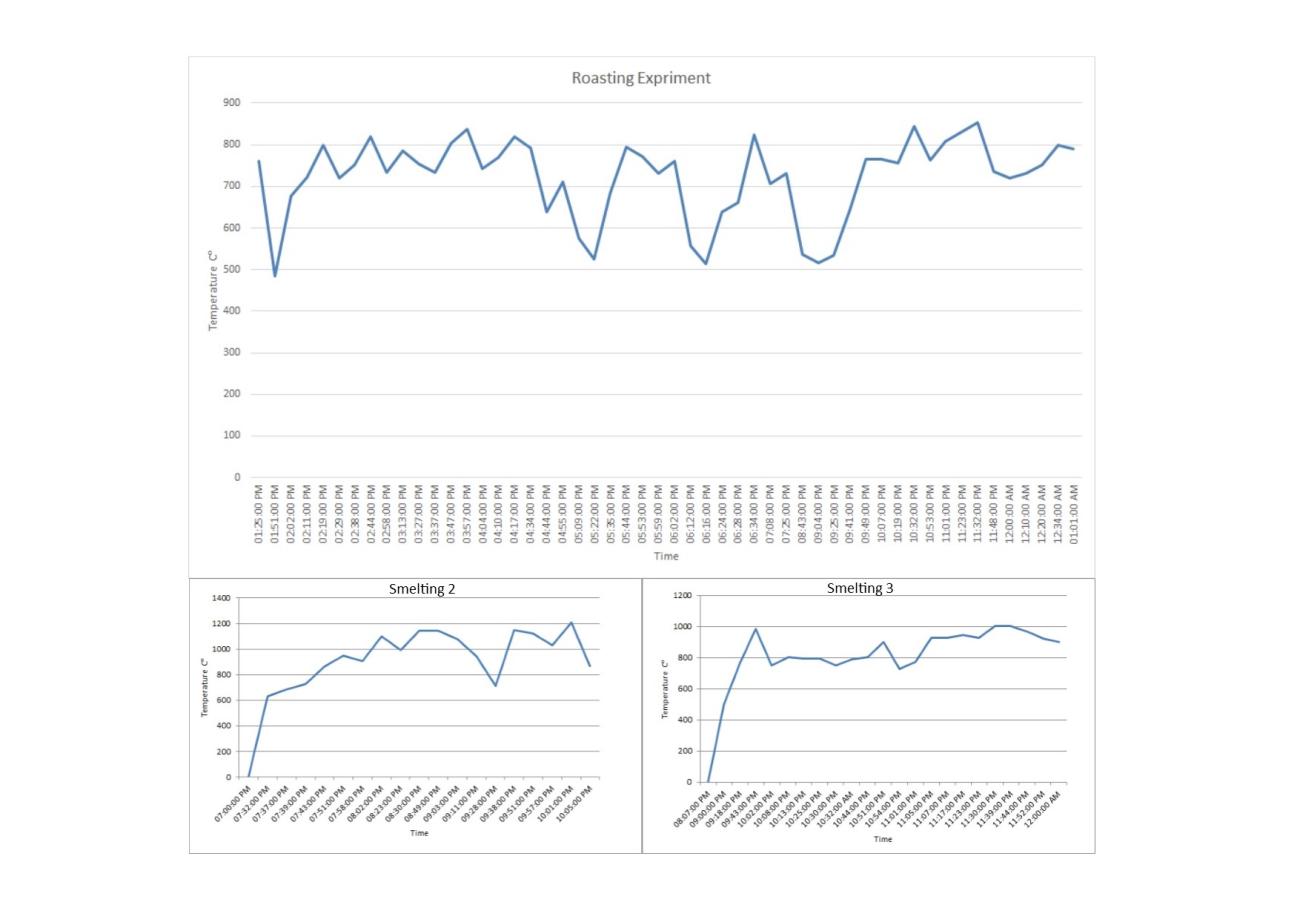 Three fuels have been tested during the experiments: dry pinewood, olive oil (as a starter/additive for the wood) and olive pomace (probably largely available in an olive-oil producing site, and, being a discard product, not precious as the actual oil). Compared to previous pilot experiments, the main novelties of this second series of trials were the use of the sulphidic copper ore as Chalcopyrite (from Congo), which requires a multistep roasting-smelting process, and the record of the thermal data collected during the experiments. A series of videos for each phase of the experiment has been recorded. Despite what is stated by the excavator (Belgiorno, 2017, p.24), the choice to use Chalcopyrite was taken due to the preliminary chemical analyses carried out on the slags from Pyrgos-Mavroraki (Giardino, 2000; Giardino and Rovira, 2007), confirmed by the more recent ones performed by the author, which clearly show that sulphidic ores were used.