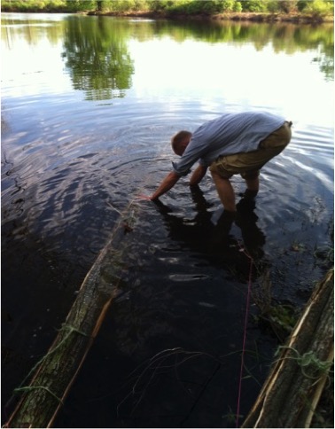 To harvest the inner bark, which possesses the bast fibres, linear cuts were made along the tree using a small knife and wooden barking spuds were used to separate the junction between the bark and phloem (See Figure 1). This layer peeled off effortlessly, creating a smooth, uniform surface. To ensure enough material was harvested, two trees were stripped completely, with an average height of 23.5 meters and 21.75 centimetre base diameter. Once this was done, the removed bark was tied into two bundles and transported to Potsdam, New York. It was immediately submerged in the Raquette River, weighed down with cinder blocks, and left to soak for 38 days (See Figure 2). The time for this process may vary; although the longer it soaks the easier it becomes to work with the fibres (Whitcombe, 2004). This process, known as retting, is the rotting away of the cellular tissues and pectins that hold the inner and outer bark together (Roberts, 2007). Once this material breaks down, the inner bark can be easily separated from the outer bark, which is then disposed. Retting is not a process required for the use of all fibres. Depending on the type of material used to produce cordage on Easter Island, the Rapa Nui people may or may not have used the retting technique.