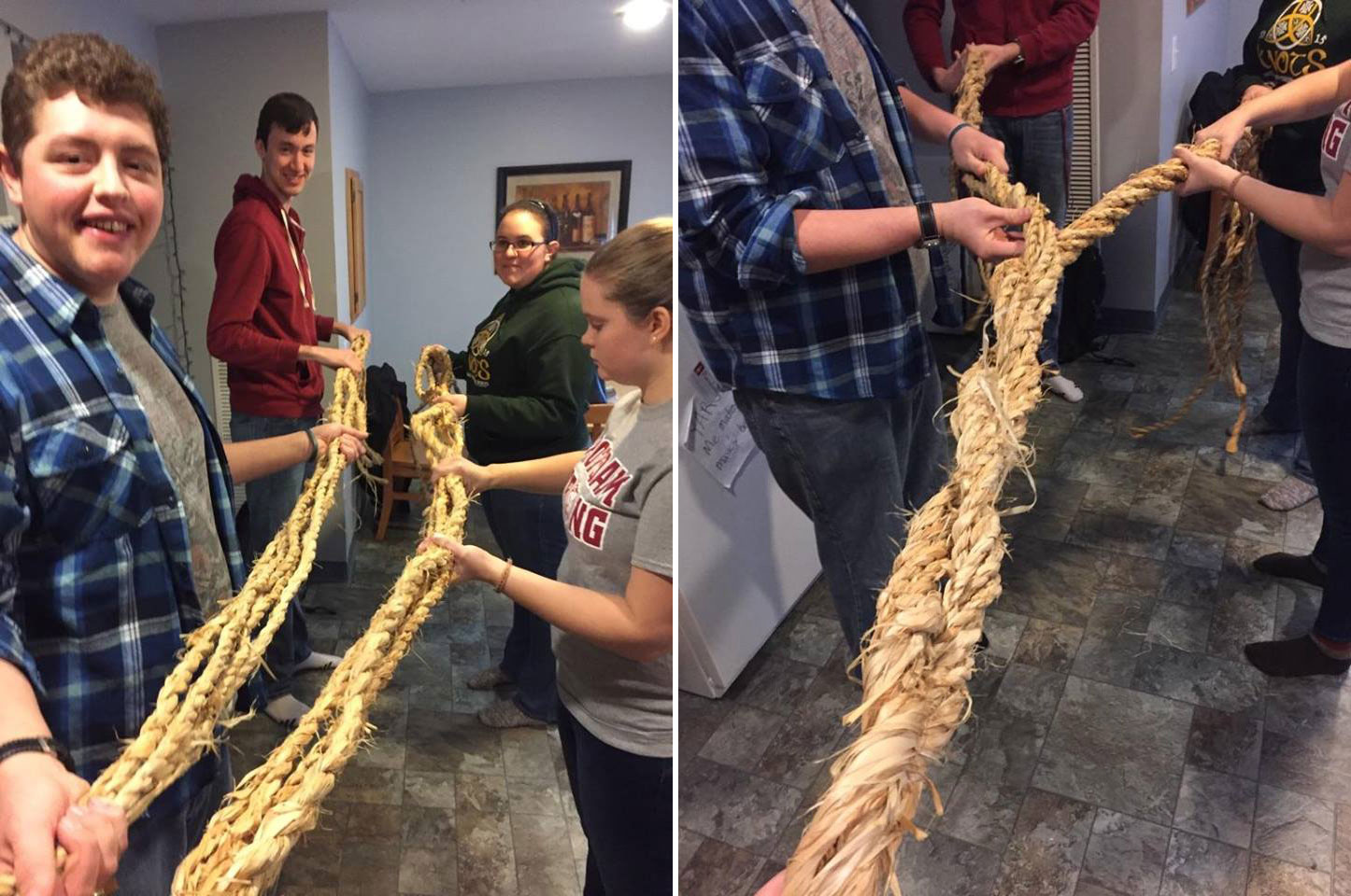 The two-ply rope segment was constructed first. With the assistance of one other person to keep the mass amount of fibres separate, a rope approximately 4 meters in length was constructed (See Figures 5 and 6). This method requires splicing, as fibres taper off and become thin new fibre is added. This can create weak points in the rope.