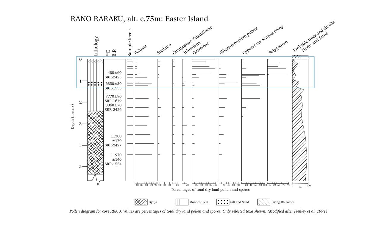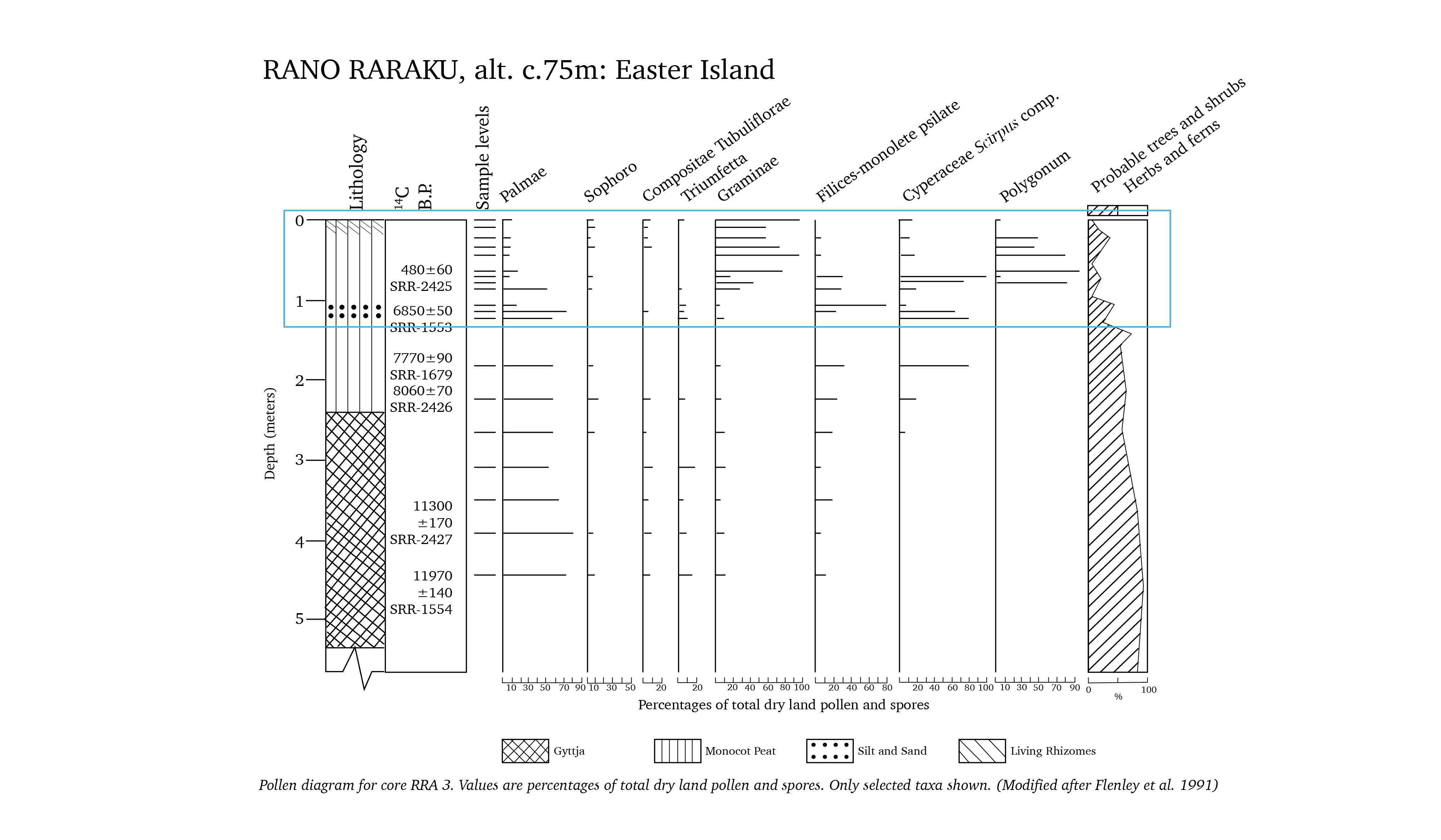 With these calculations made, the environmental impact (i.e, the quantity of felled trees required) of rope production could be determined. To do this, the vegetation on Easter Island was examined. Pollen charts show the changes in vegetation through time. The island experienced long-term changes (See Figure 10), where the flora remained relatively stable throughout the Holocene but then there was a dramatic change coinciding with the arrival of humans (blue box, Figure 10). The column on the far right shows the changes in levels of trees and shrubs against the changes in levels of herbs and ferns. The dramatic increase in herbs and ferns occurs once the loss of trees and shrubs begins (Flenley, 1993). To fully understand the deforestation, a timeline of events was added to the pollen chart (See Figure 11). There was a dramatic decrease in Palmae and increase in Graminae (now known as Poacea). This indicates that the canopy was being opened up and removed (through felling of trees) and grasses grew in their place. In addition to moai construction and movement, several anthropogenic alterations were being made, including the use of slash and burn agriculture and the construction of shelter and watercraft (Hunt and Lipo, 2011). While slashing and burning the scant resources they had seems foolish to us, it was in an effort to produce more fertile farmland. If the Rapa Nui people were in fact using grasses for cordage production, this method would have destroyed precious material. However, grasses have a rather quick regeneration rate, reoccurring annually. On the contrary, if trees were the source then the regeneration rate is much slower (Folk, 2017).