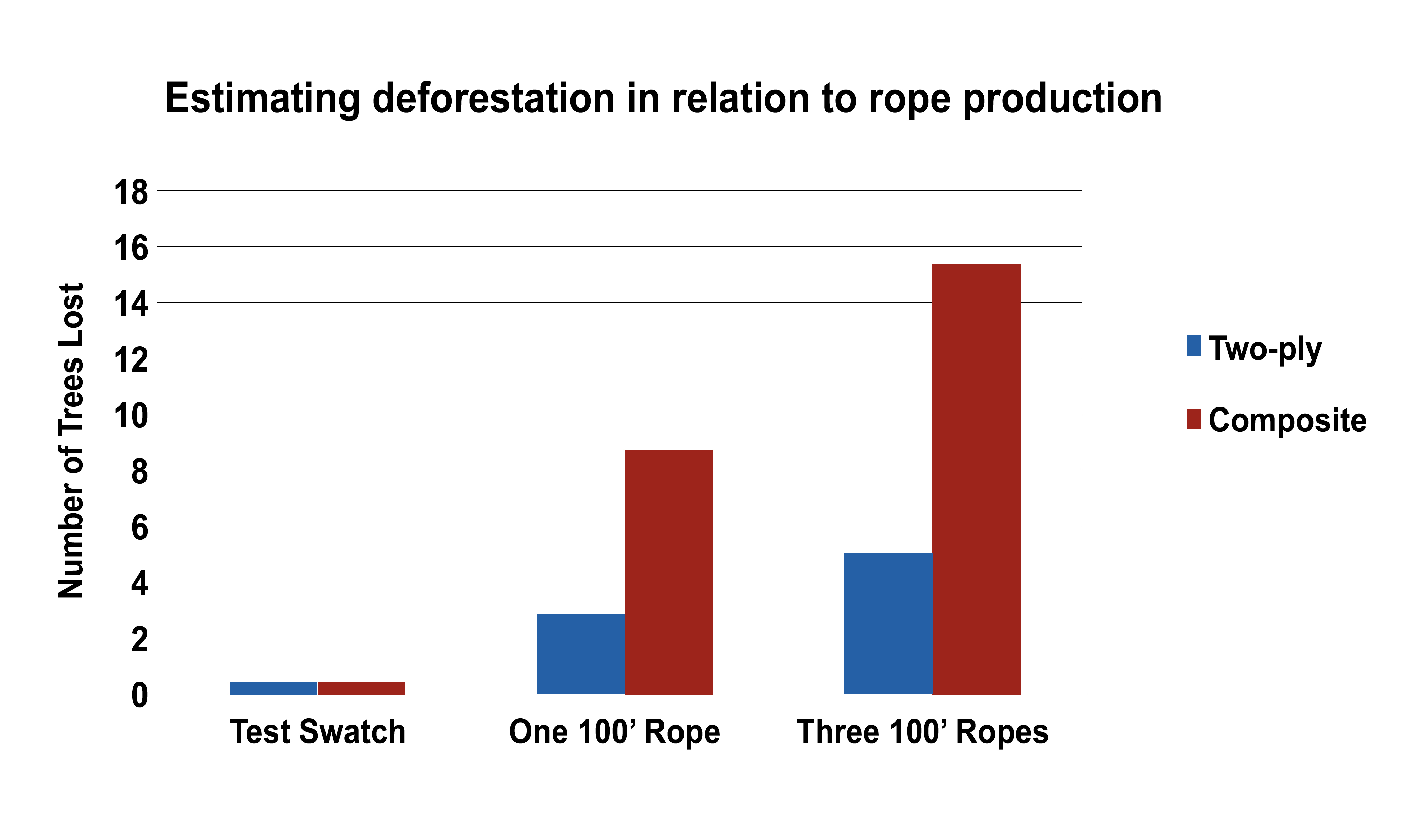 Calculations were compiled from each moai requiring three ropes of approximately 30.5 meters (100 feet) in length to move. As illustrated in Figure 9, once projected on a large scale, the composite rope would require significantly more material to construct enough cordage to move the moai on Easter Island. Ultimately, this results in the loss of more trees. Approximately 9 trees or 9,200 grams of fibre are required to construct three ropes approximately 30.5 meters long using the two-ply method. For the same amount of cordage, using the composite technique, it would require approximately 15.6 trees or 15,947 grams of material. The length of 30.5 meters is an estimate based on the necessary clearance for the statue if it were to fall, and individuals to hold the ropes. Calculations can continue to be made adjusting to an increasing or decreasing length for each rope.