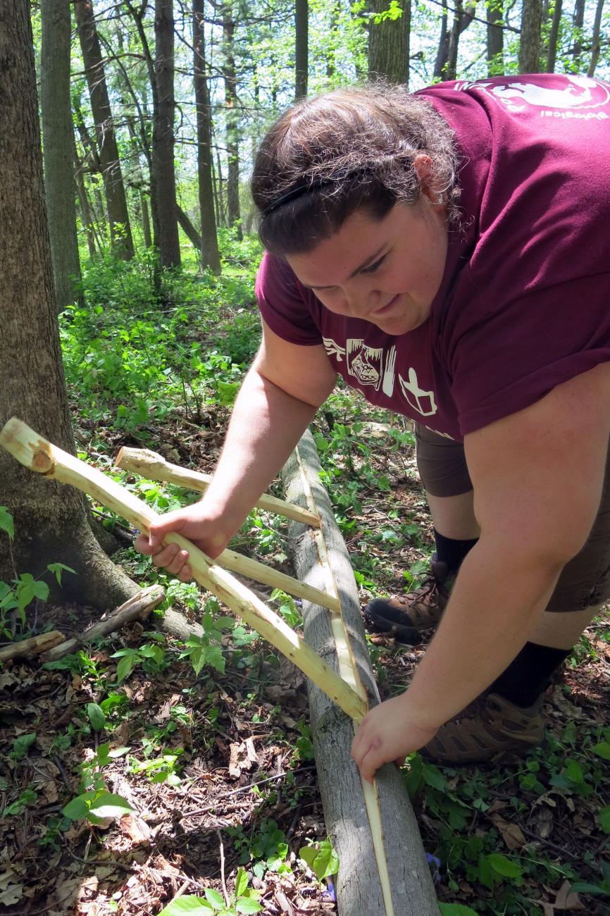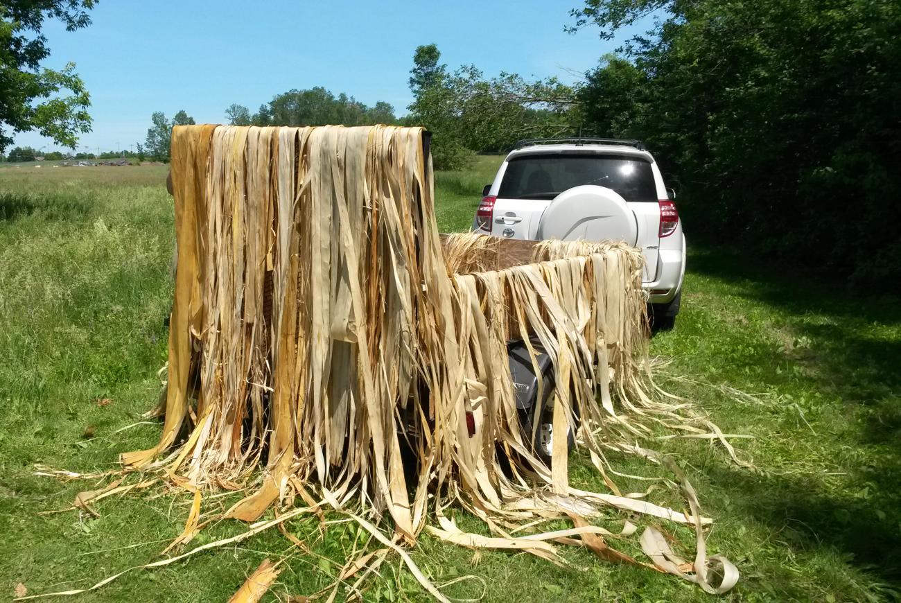 Before construction could begin, the resources had to be acquired. Without access to materials that existed on Rapa Nui a substitute was determined. Through examination of pollen charts dating to the height of construction and movement of the moai (Flenley, 1993), a fibre source was chosen. While a variety of sources were present on the island at this time, Thespesia populnea was chosen because of its bast fibres (Orliac, 2000). These fibres are ideal for rope production and therefore would have likely been selected for use. Tilia americana is abundant in North-eastern America and was the substitute chosen to carry out this experiment. With the assistance of a farmer in Huevelton, New York and three volunteers, two trees were felled and stripped clean of their bark.