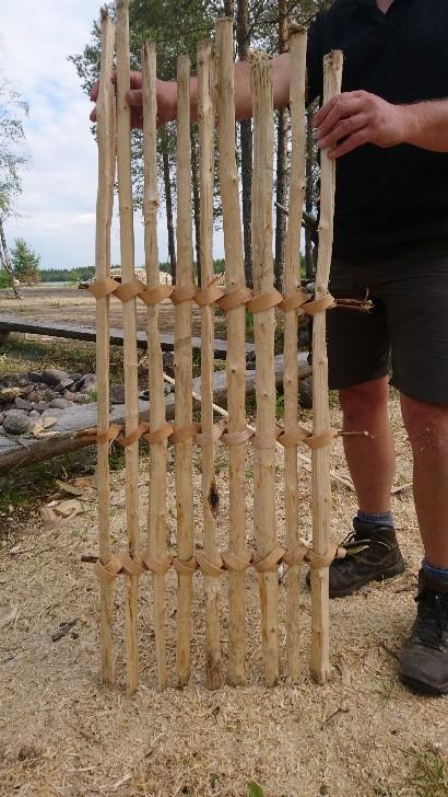 The original lath screen section incorporated thin strips of willow circa 5-10 mm in diameter and bindings of birch bark. Both were collected in 5 minutes from the Kierrikki site.
