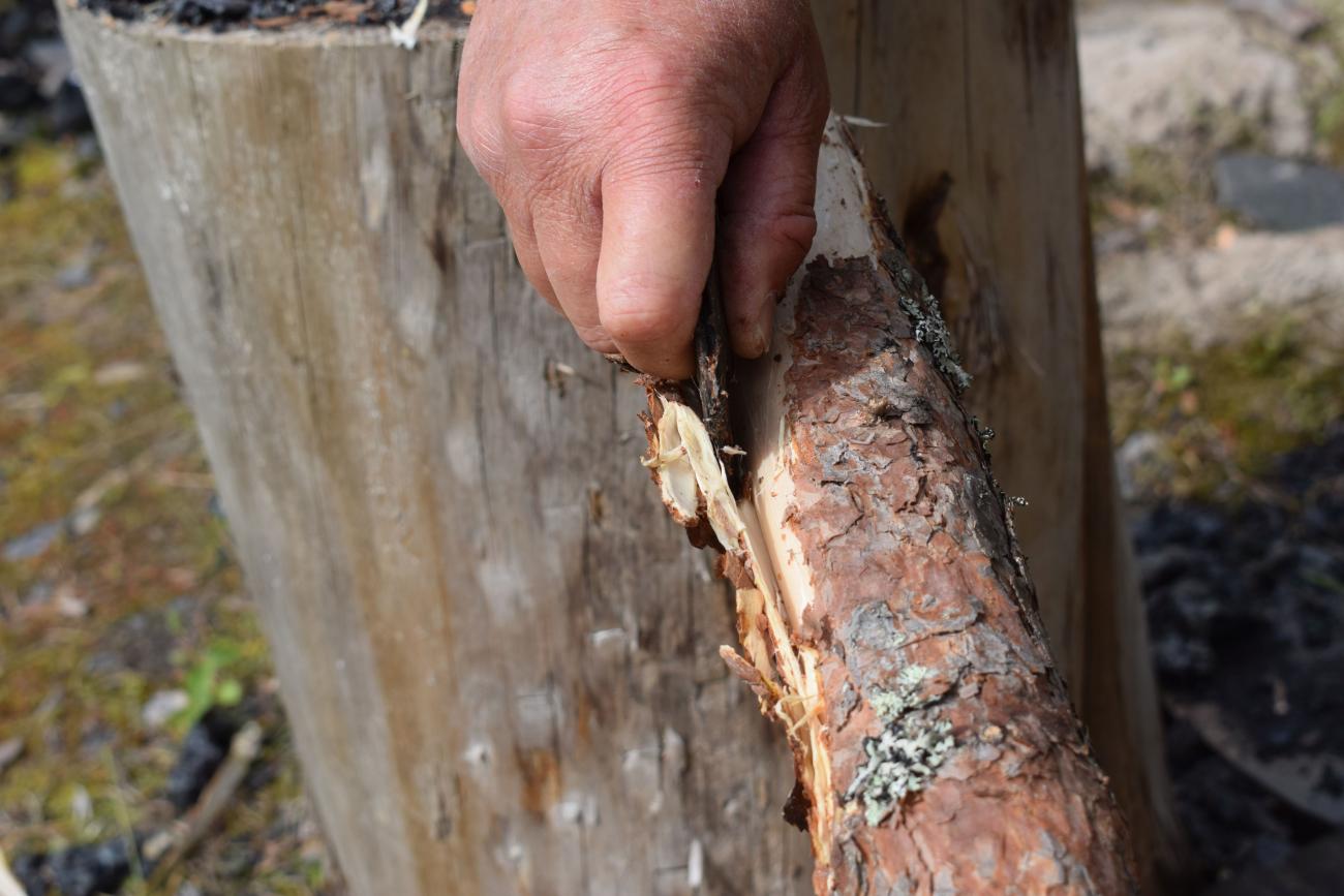 Side branches were removed by twisting and snapping by hand (See Figure 3a). The pine laths in the Purkajasuo section had no bark, therefore debarking was required. This was accomplished using an unmodified thin piece of slate that was employed in a similar manner to a skinning knife (See Figure 3b) and took 120 minutes (40 minutes per tree).