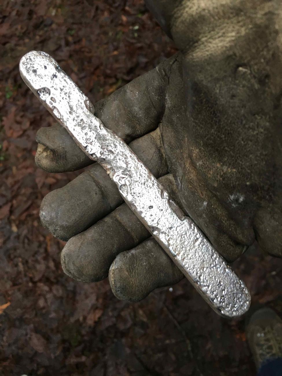 I poured molten silver into the cloth lined mould first. Just as I finished pouring the ingot it began to violently erupt and spit silver. The second ingot was poured into the mould prepared with animal fat. This was less violent than the first although it did flare up somewhat. The third mould that had clay applied to the cloth poured well (See Figure 6). Figure 7 shows the moulds and ingots after pouring.