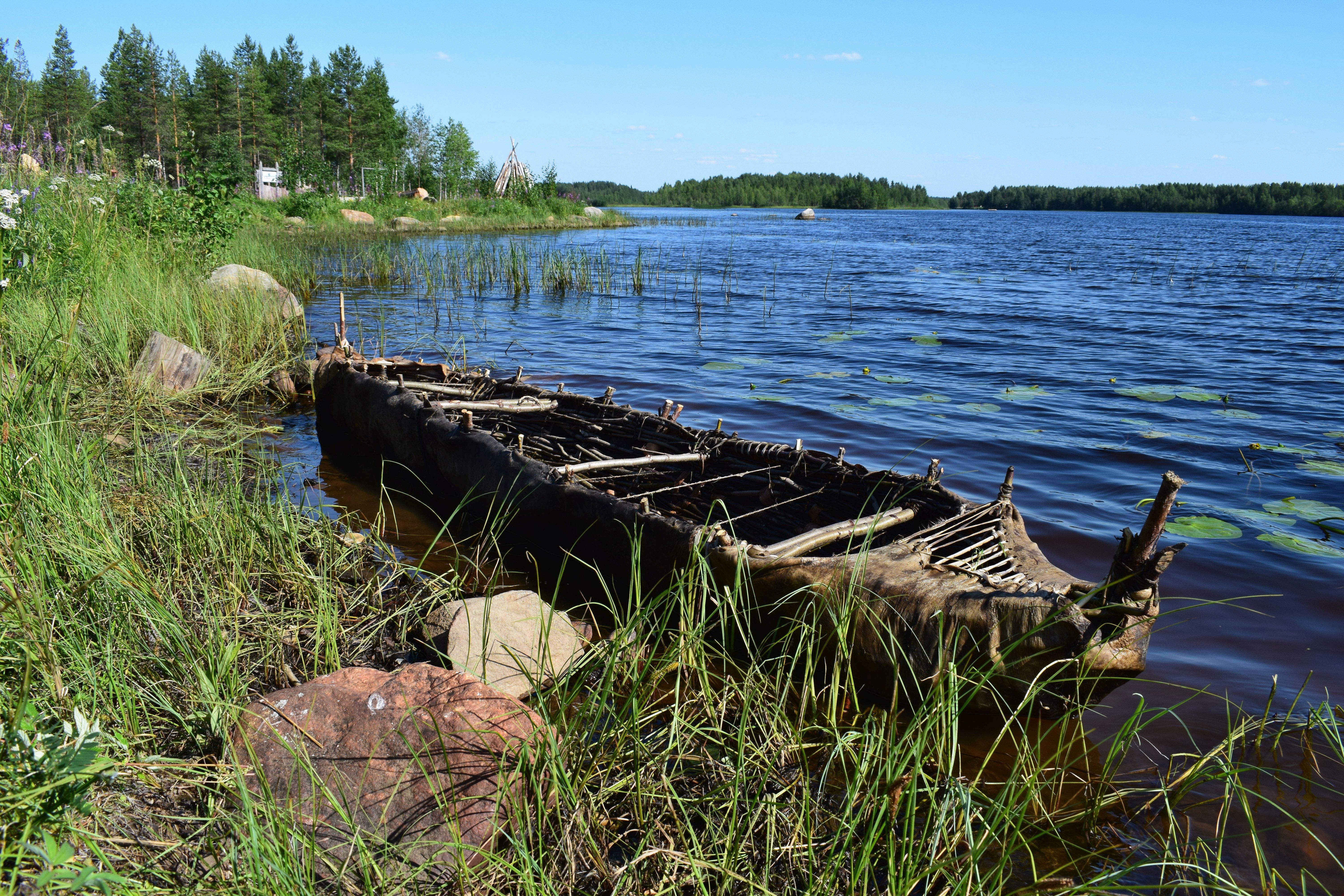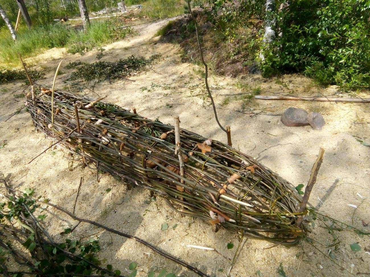 In order to involve as many students as possible, it was decided that a suitable week-long project would be to build a canoe from materials sourced at, or local to, Kierrikki Stone Age Centre. Several log boats are already present in the Stone Age Village at Kierrikki, as was a skin-on-frame canoe made in 2016. However, the split wood frame of that canoe had cracked and twisted and the tar-treated skin had hardened and become brittle, to the extent that it had torn in several places, rendering it unseaworthy. Given the condition of the canoe, we chose to dismantle it and construct a new basketry-frame canoe, reusing the hides where possible. The completed canoe would then be displayed in the Stone Age Village.