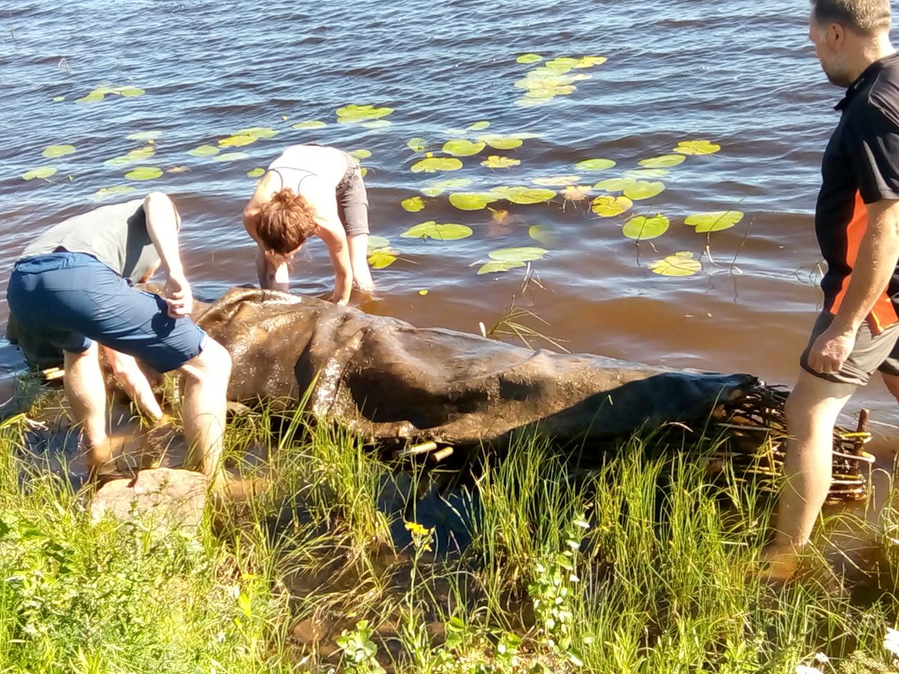 While the basketry framework was soaking, the hides were removed from the original canoe and worked in the warm shallow water of the lake. This involved scrubbing with stones and sand, and working by hand in order to regain the flexibility. A combination of regular stretching and re-wetting of the old hides meant that after two days they were ready for fitting on the new canoe.