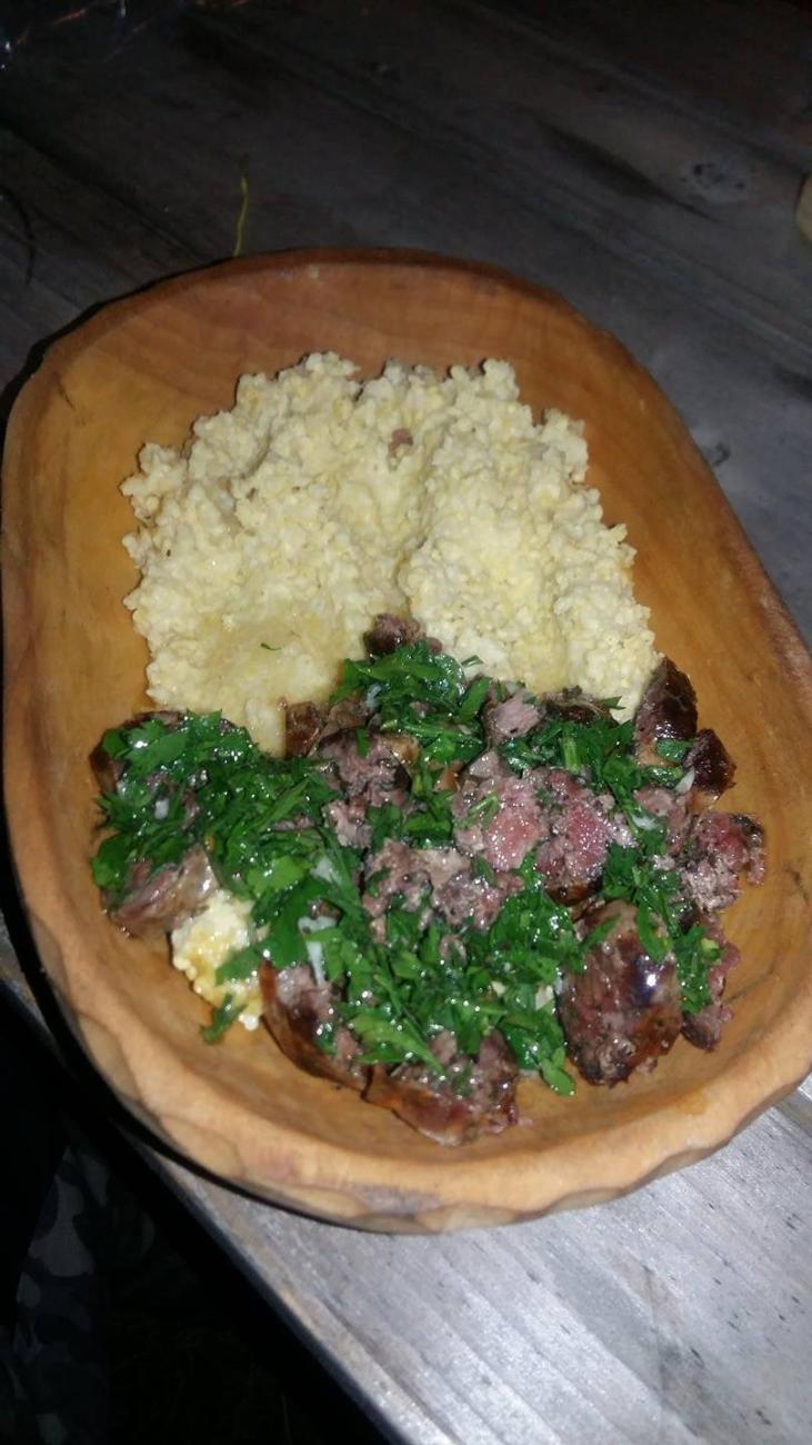 The third stage of the project consisted of home testing the recipe. In the first test a regular clay pot and a grate were used. Attention was focused more on the taste and not on the timing required for cooking. After making the first test (See Figure 6), we decided that some changes had to be made to the recipe: millet food should be served more liquid, much more sauce was needed for each portion, for herbs sauce it would be better to use seasonal ingredients and it would be preferable to use a mead vinegar instead of wine vinegar. At the taste level it was also noticed that the sauce complemented the millet porridge and sausages very well. A second test was made using one of the pots made for the experiment and the grate for the sausage. With the additions made, the recipe was much tastier. It was also noted that for cooking it takes 90 minutes to prepare the ingredients (for making sausages and the green herbs sauce) and another 90 minutes to boil the milk with millet in the handmade cooking pot. Having a little experience and confidence the members of the project decided that the clay pots, the firedogs with the grate and the recipe were ready to be tested during the festival.
