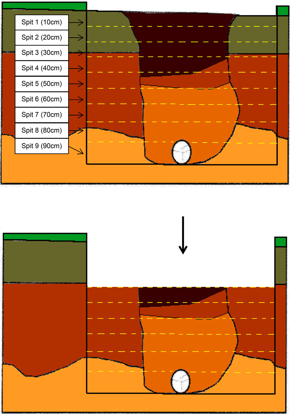 The arbitrary level excavation method (See Figure 9) is the standard excavation method for forensic excavations (Komar and Buikstra, 2008). During the arbitrary level excavation of a grave, first the size of the grave is estimated, followed by soil removal in predetermined layers. As evidence is identified, the surrounding soil is removed leaving each item upon a soil âpedestalâ. These items are only removed when they are hindering the progress of the excavation (Connor, 2007). This method ignores any stratigraphy present. The primary emphasis when utilising this method is often upon the recovery of artefacts and human remains, rather than understanding the entirety of the grave formation process.