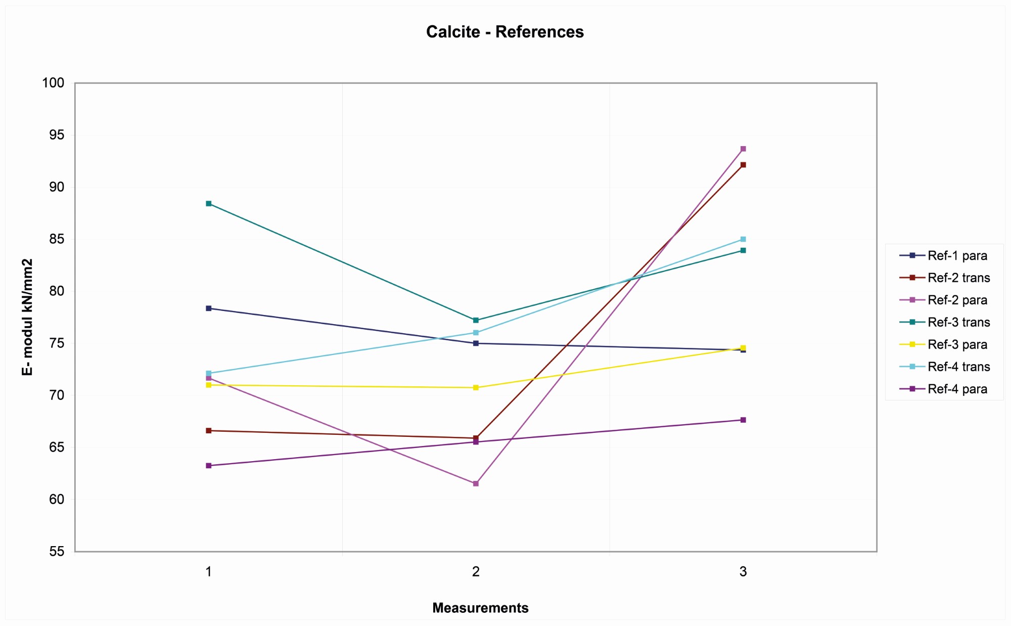Calcite blocks show a peculiar trend where, in almost all cases, there is a minimum in the middle measurement. This trend appears in a lesser extent in the other kind of rocks, where the median value appears to be a minimum or in some cases a maximum. That could be caused by the fact that the propagation of the wave in the central part occurs in a different way than in the areas at the borders, where the wave is partially dispersed out of the block. Other than this characteristic of the measurements, calcite is an elastic rock with an ample range of variation (See Figure 10).