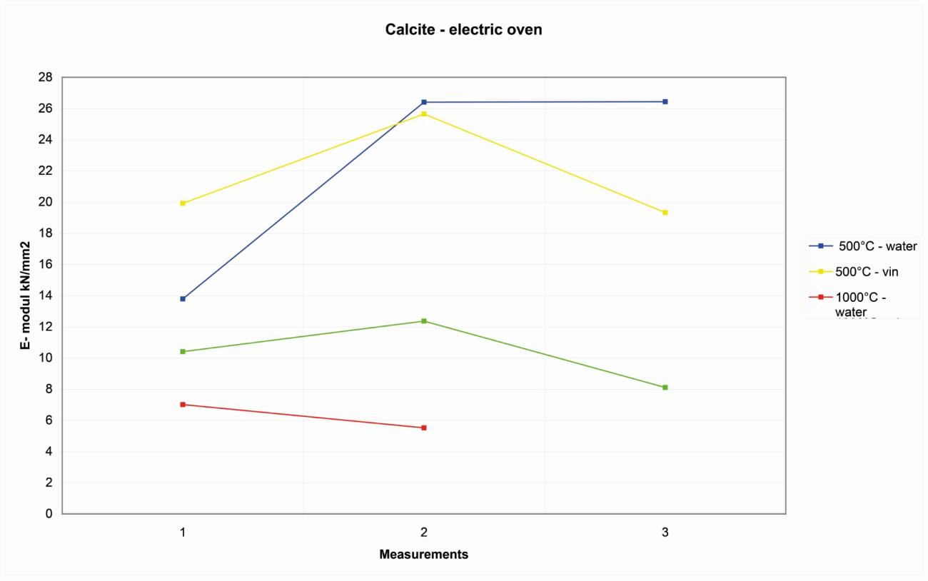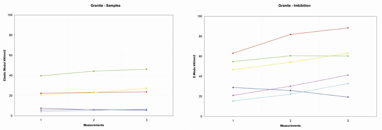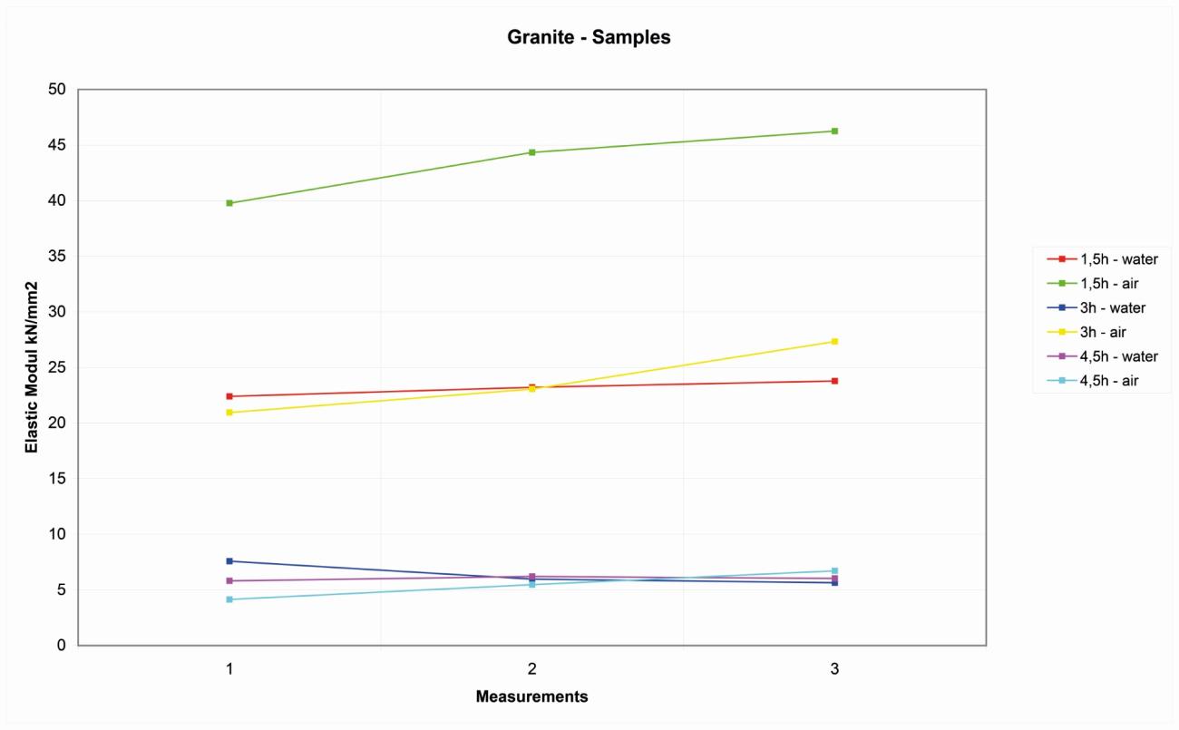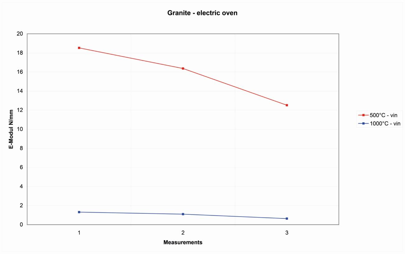 After the first 1.5 hours at 500-600° C, the rock had an elasticity that is comparable with the natural rock, even if a small decrease of elasticity is already visible and appreciable. In the samples that have been fired longer and under higher temperatures, and especially on the samples that have been cooled down with water, the decline of elasticity can reach lower values. Long-heated granite samples can see a decline of elasticity of up to 60KN/mm2.