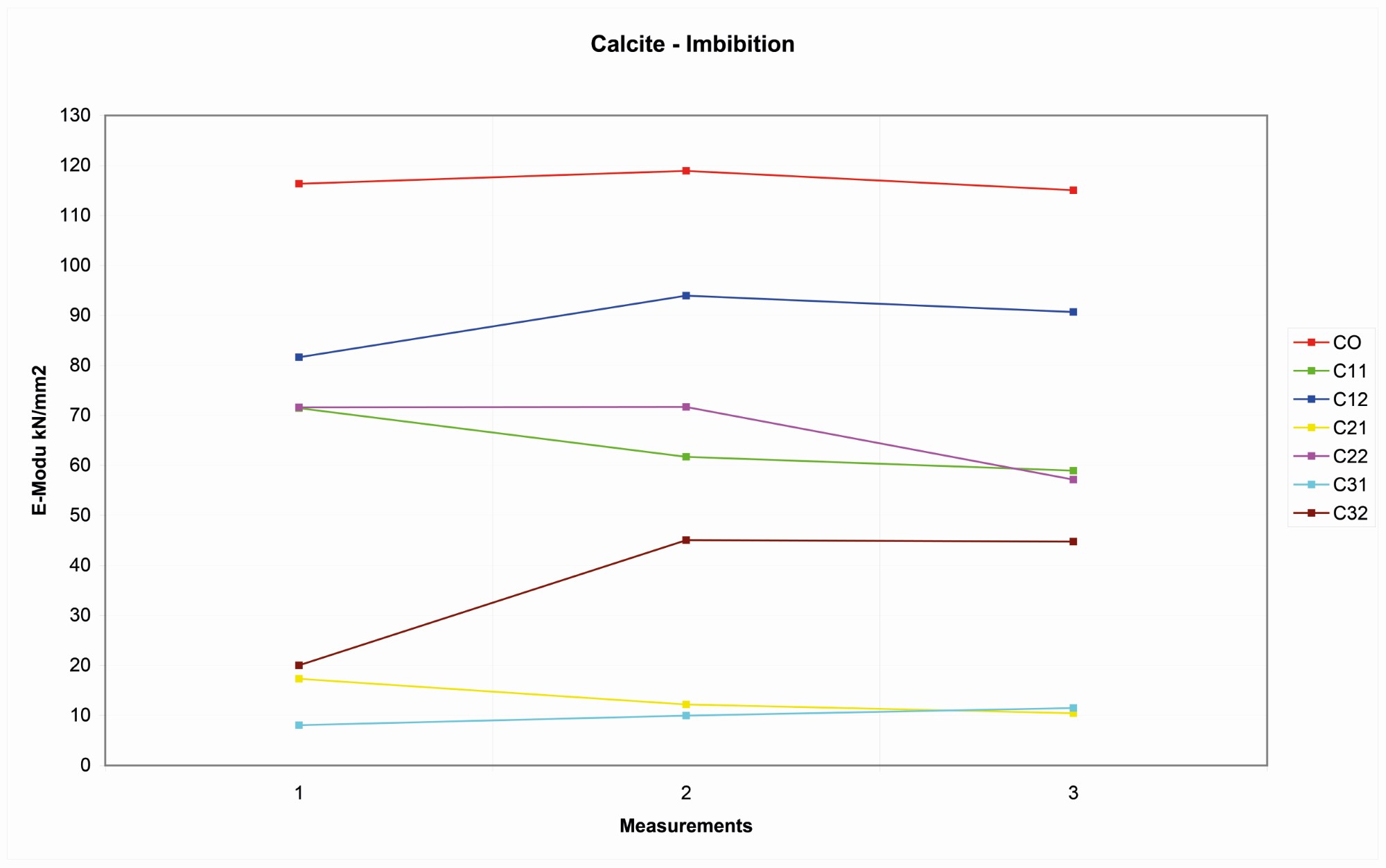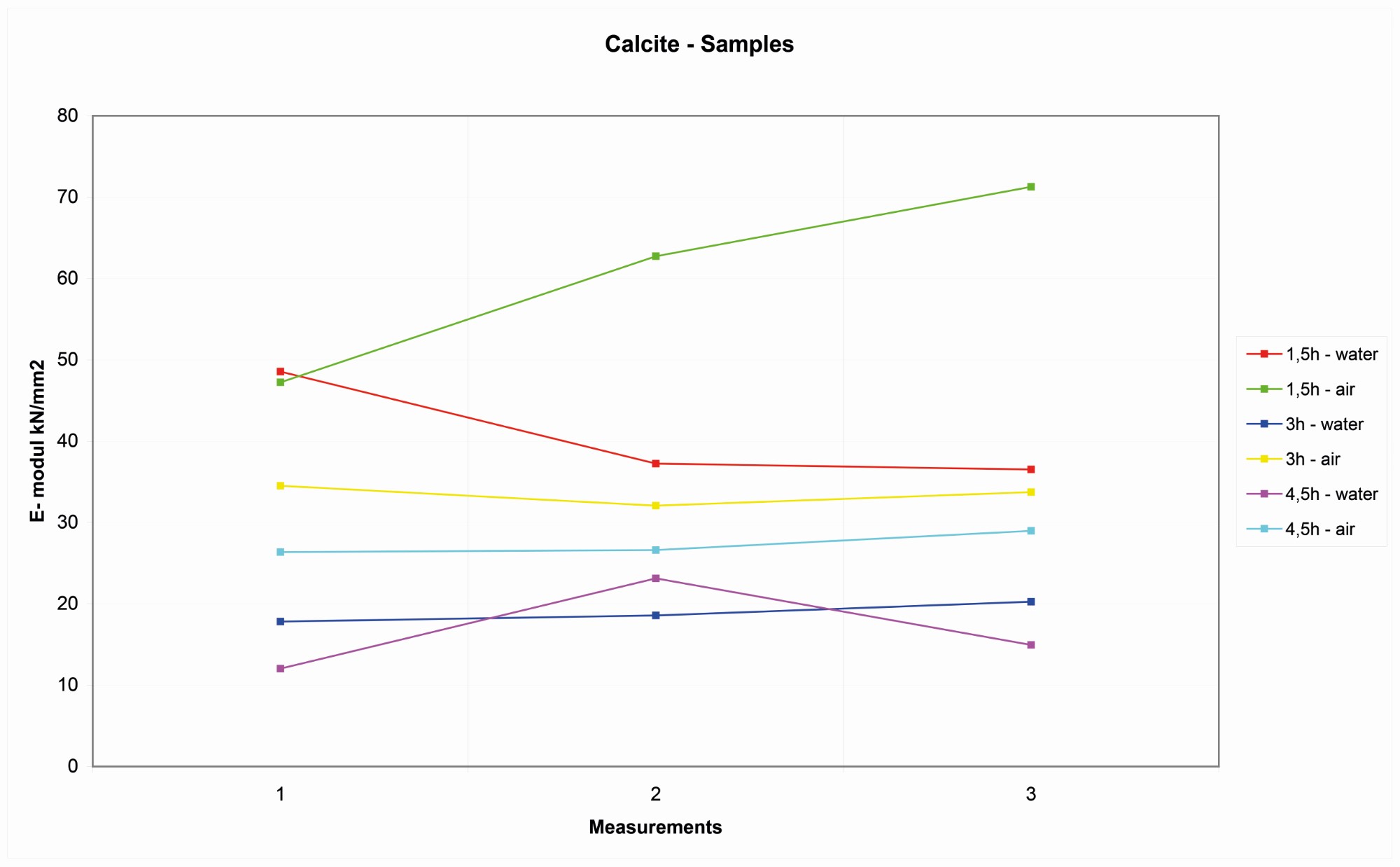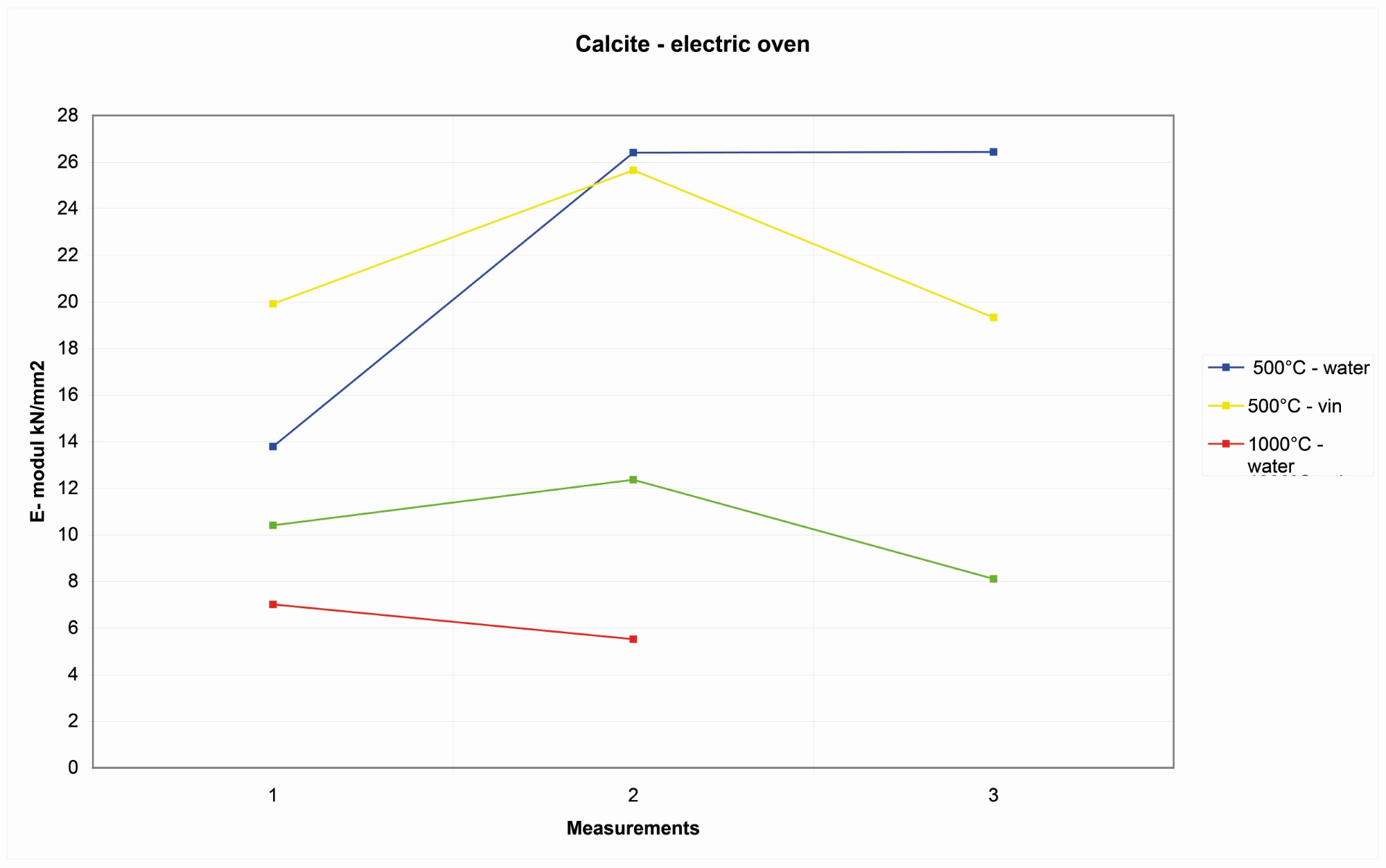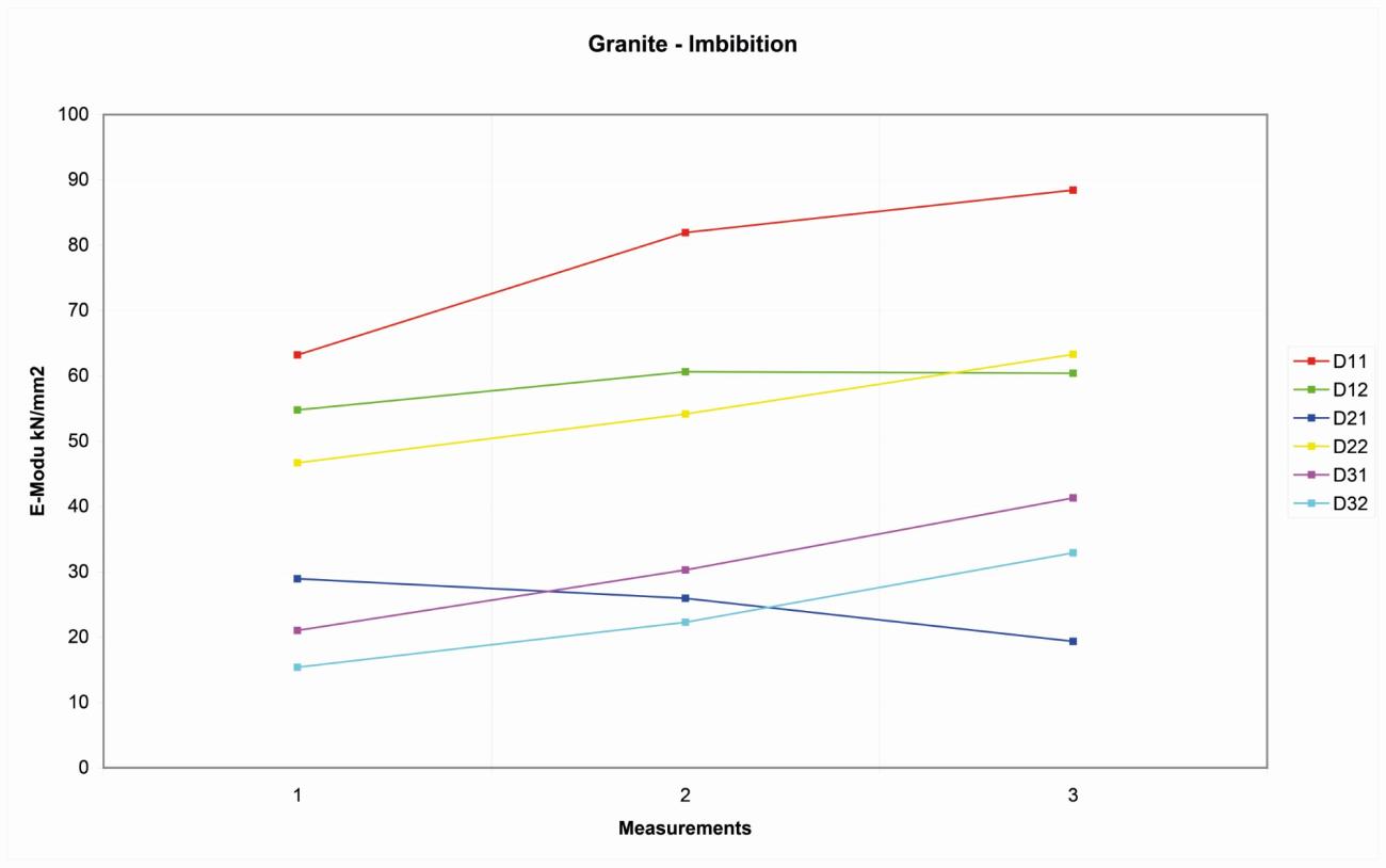 After the first 1.5 hours at 500-600° C, the rock had an elasticity that is comparable with the natural rock, even if a small decrease of elasticity is already visible and appreciable. In the samples that have been fired longer and under higher temperatures, and especially on the samples that have been cooled down with water, the decline of elasticity can reach lower values. Long-heated granite samples can see a decline of elasticity of up to 60KN/mm2.