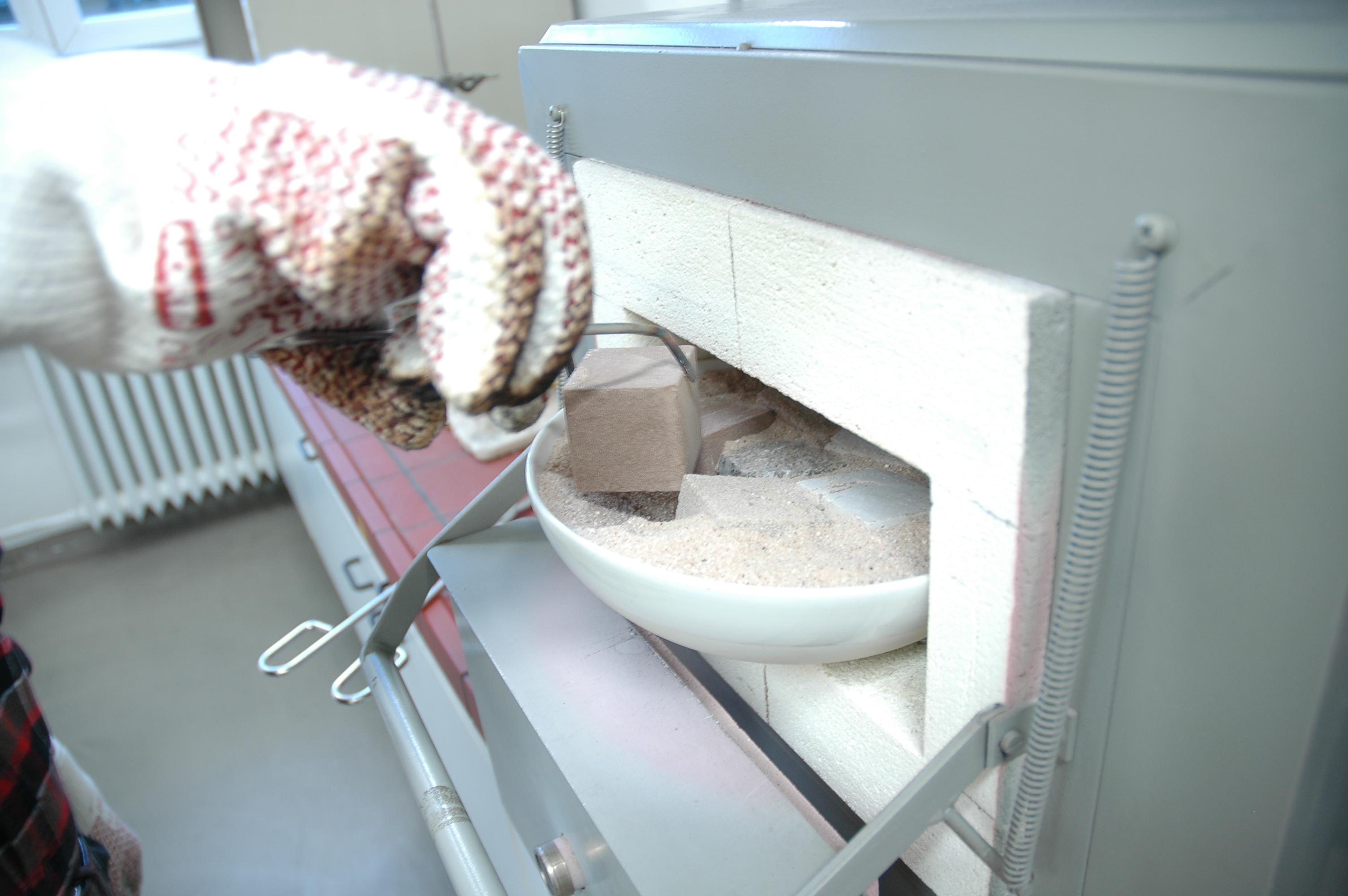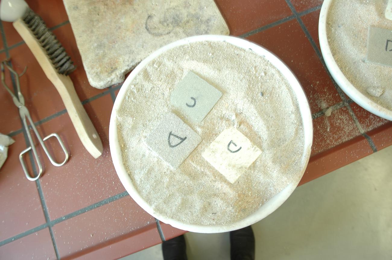 This experiment is composed of several phases: the blocks were placed in porcelain bowls filled with sand, in order to evaluate the heating effects on one side of the blocks, thereby reproducing as much as possible the situation of fire-setting (it was not possible to use the same conditions so the use of the electric oven was preferred considering the comparability of the results). The same encasing in fine sand, exposing only one face of the cubic blocks, was described as experimental setting in Allison and Bristow (1999), to simulate the natural environment. Fine sand succeeds the best in the recreation of the diffusion pattern of thermal energy on a large exposed surface (Allison and Bristow 1999). The first step of heating for 1.5 hours was skipped as, from the evidences arisen in the first experimental set, it brings less information then the following two steps.