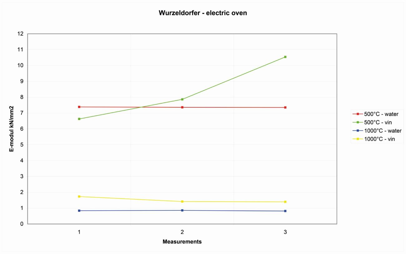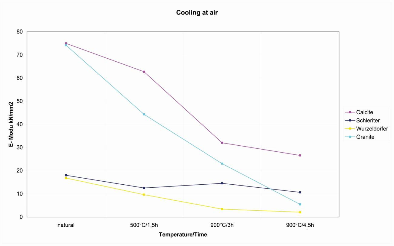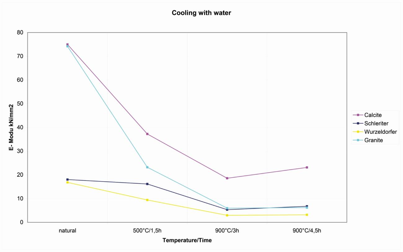 | Wurzeldorfer quartzite | A similar pattern is shown with the Wurzeldorfer quartzite. The vinegar does not work better then water as a coolant. It was also noted that the blocks heated above 900°C, as in the first experiment, show a decrease in cooling that looked more affected by mechanical stresses after the use of water to cool it of elasticity of more than 4 kN/mm2 (See Figure 18). |