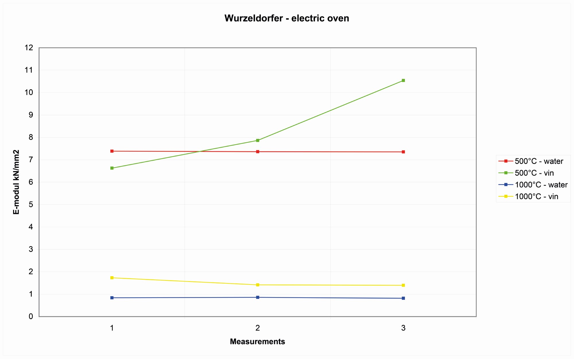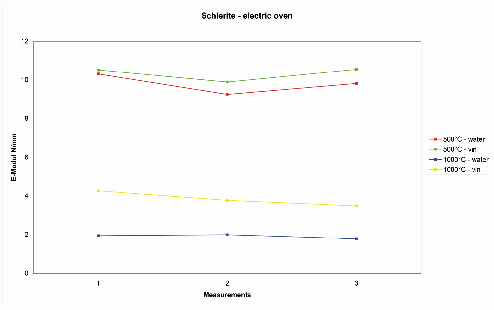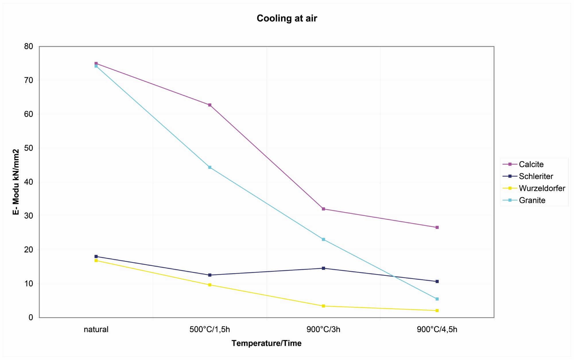 | Wurzeldorfer quartzite | A similar pattern is shown with the Wurzeldorfer quartzite. The vinegar does not work better then water as a coolant. It was also noted that the blocks heated above 900°C, as in the first experiment, show a decrease in cooling that looked more affected by mechanical stresses after the use of water to cool it of elasticity of more than 4 kN/mm2 (See Figure 18). |