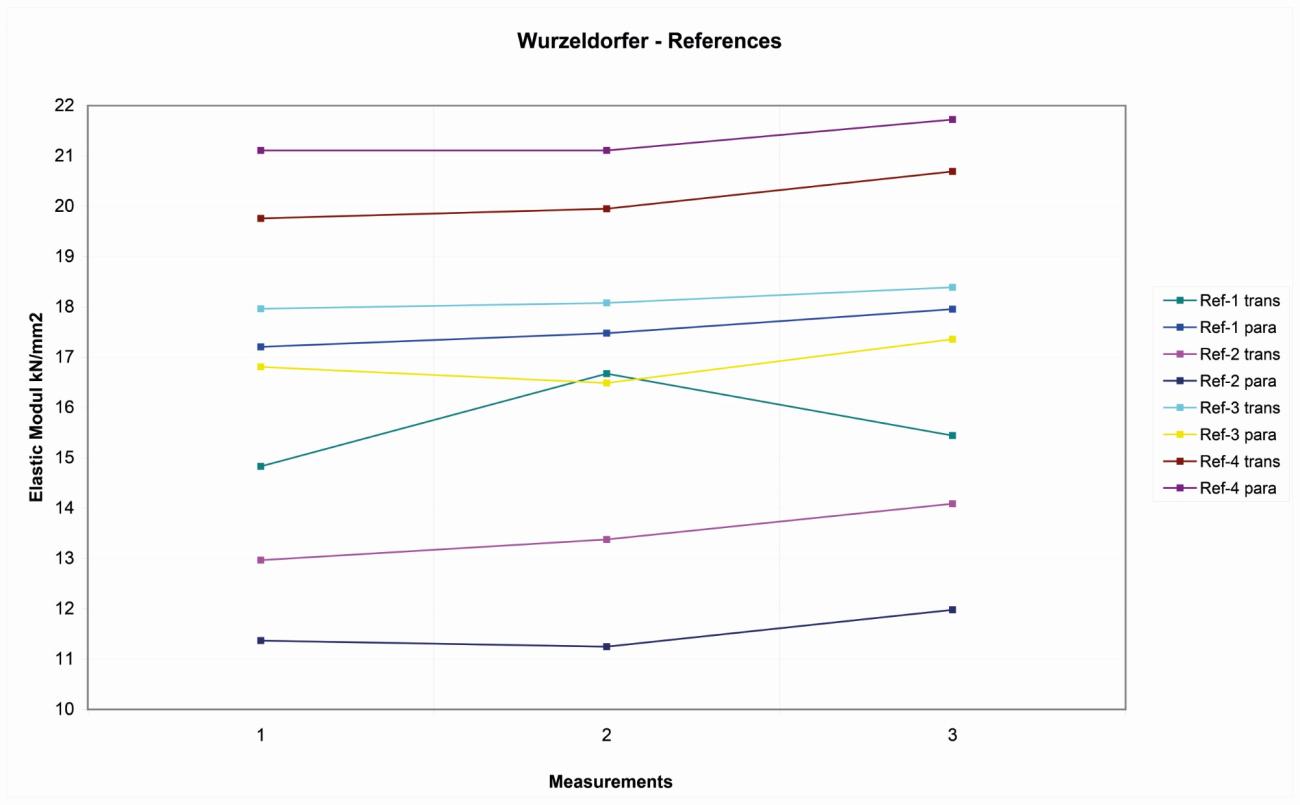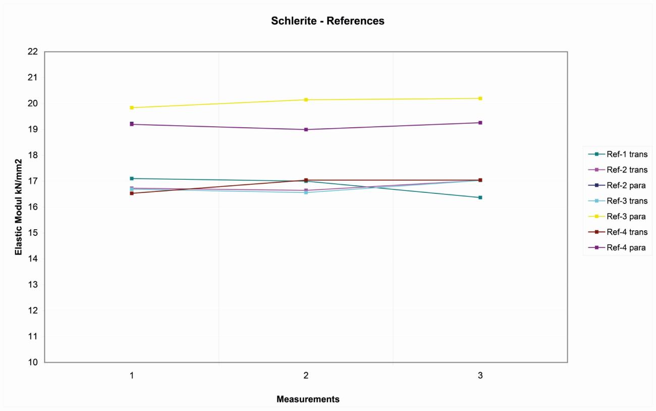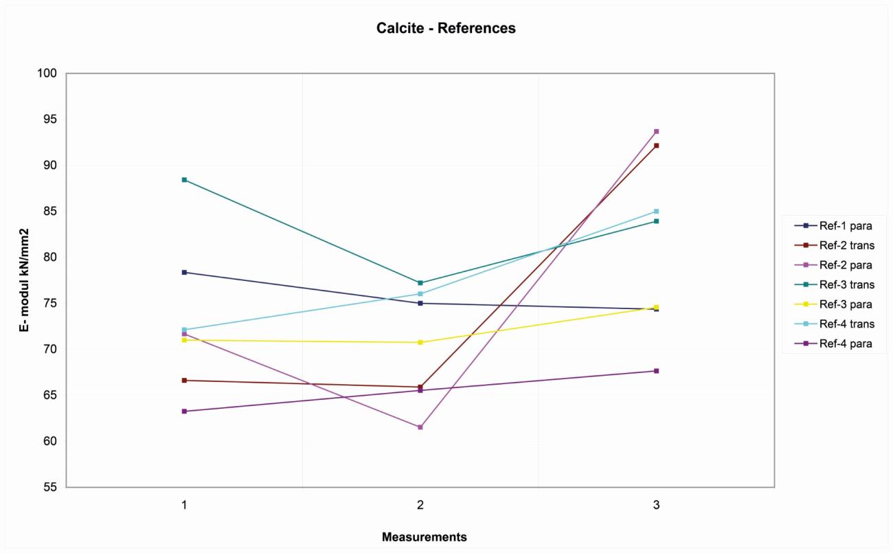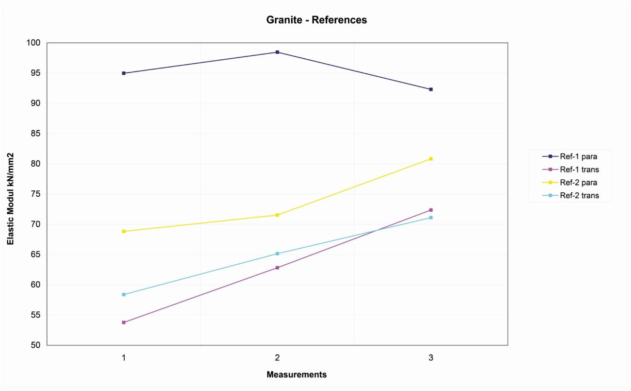 On the four Wurzeldorfer quartzite samples, the distribution of the reference values is more random, probably due to the major degree of compactness. The variation range is about 10 kN/ mm2 among 11-21 kN/mm2 (See Figure 6).