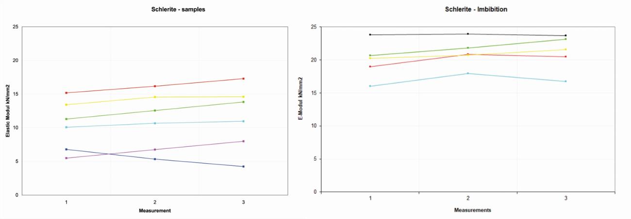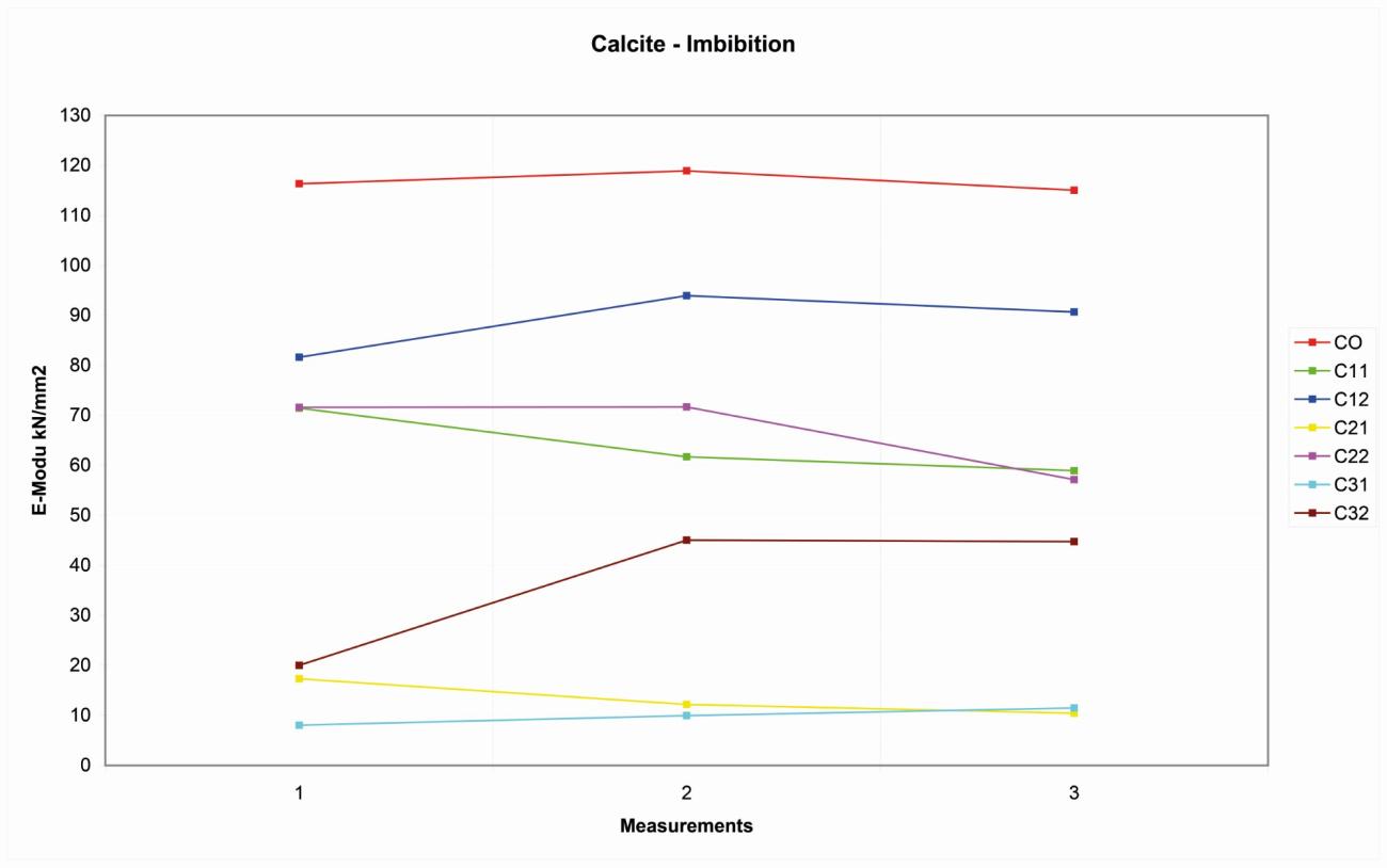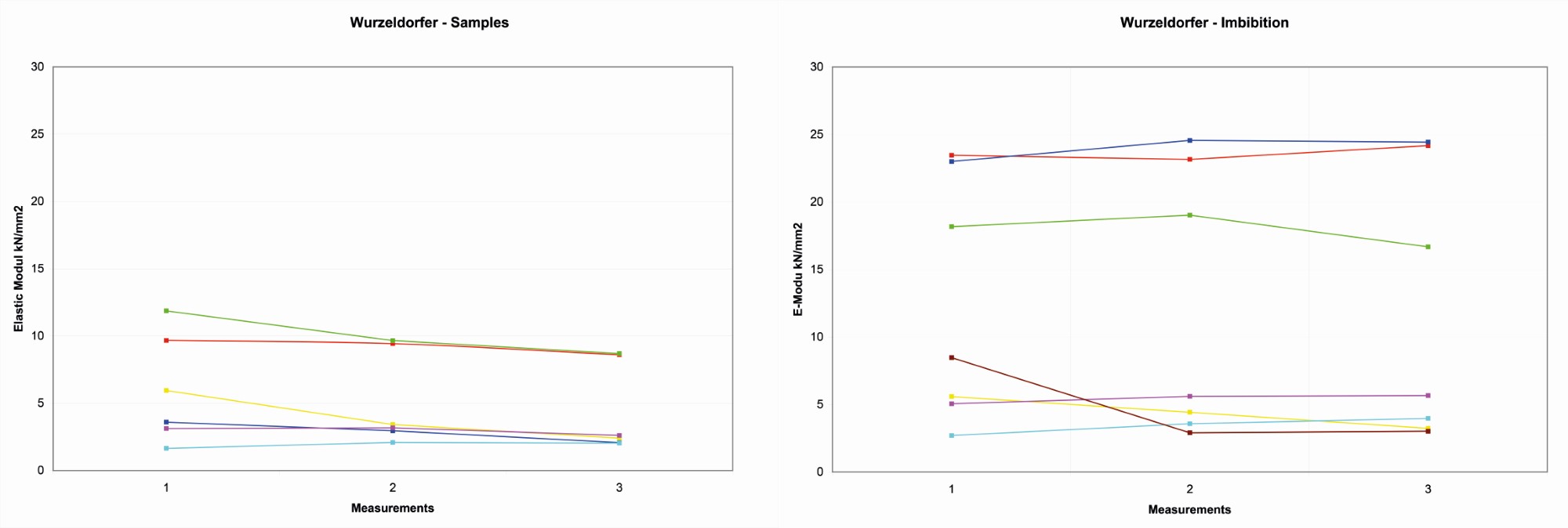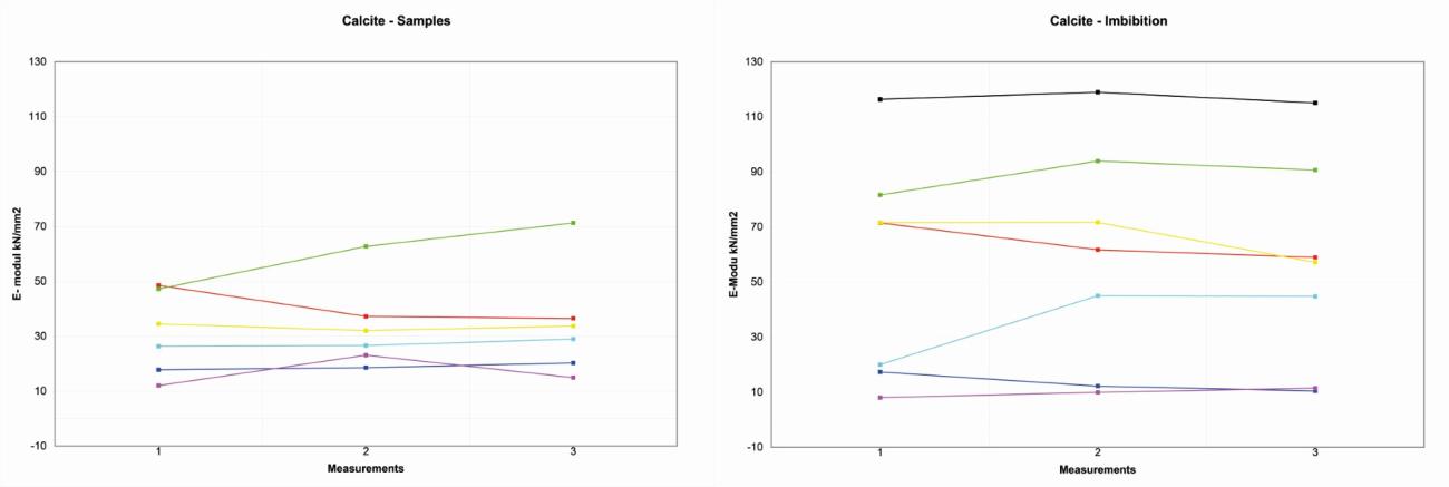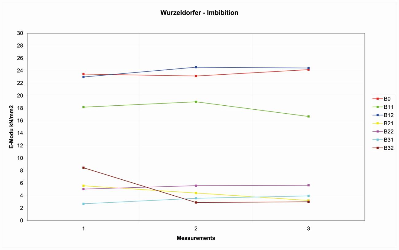 On the four Wurzeldorfer quartzite samples, the distribution of the reference values is more random, probably due to the major degree of compactness. The variation range is about 10 kN/ mm2 among 11-21 kN/mm2 (See Figure 6).