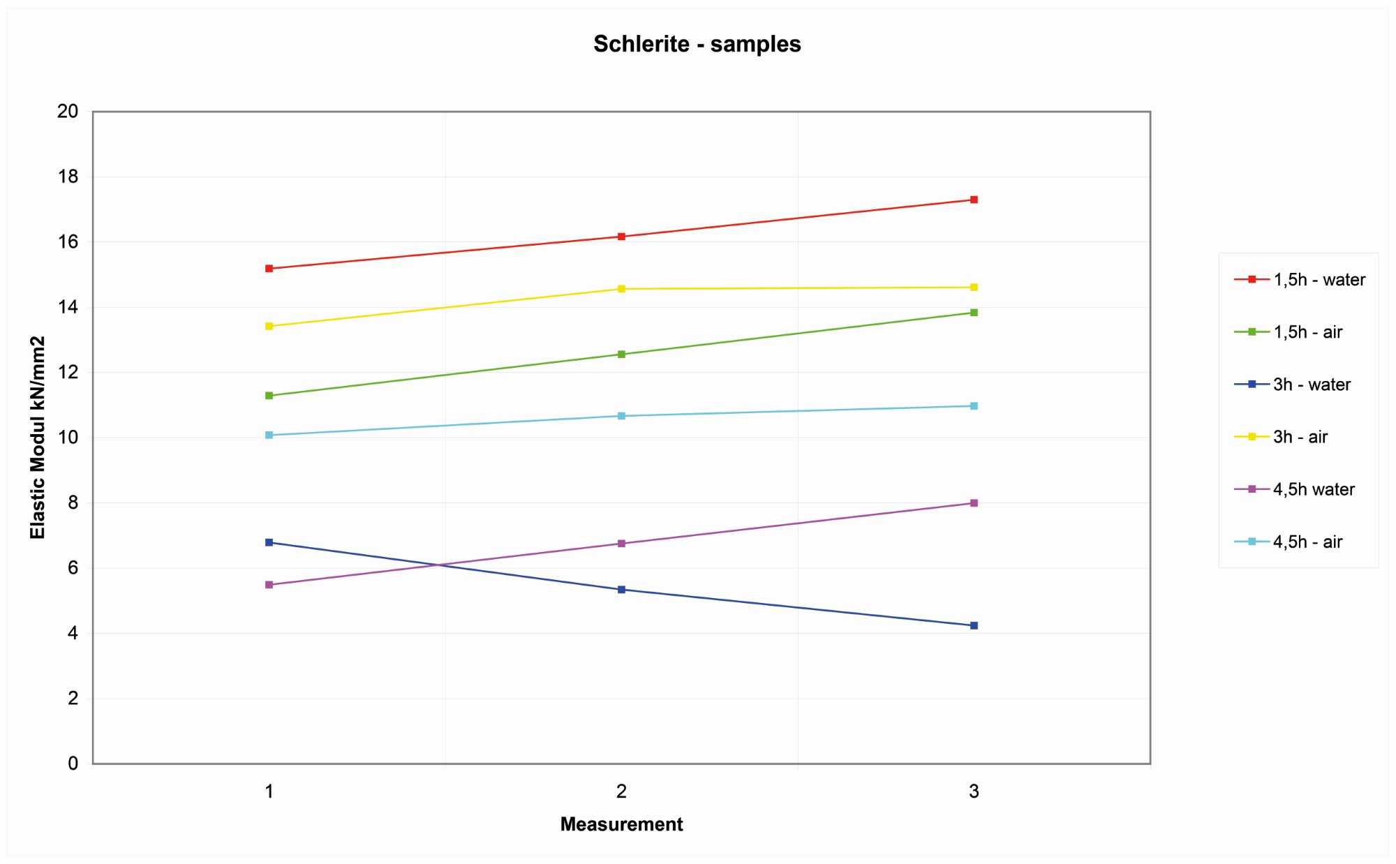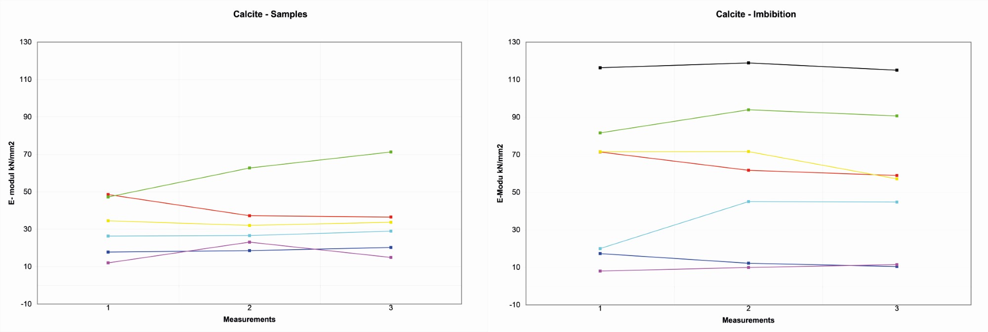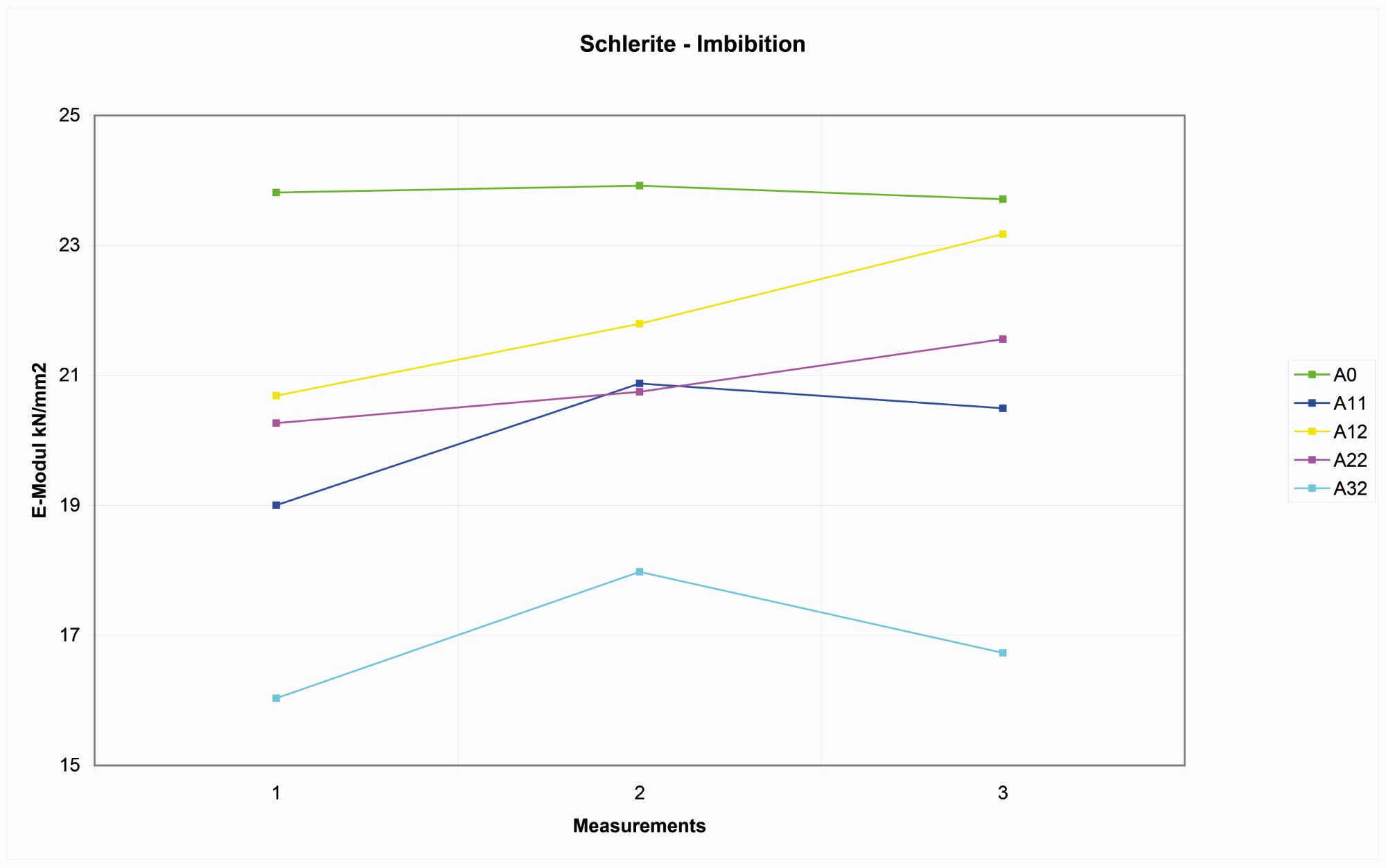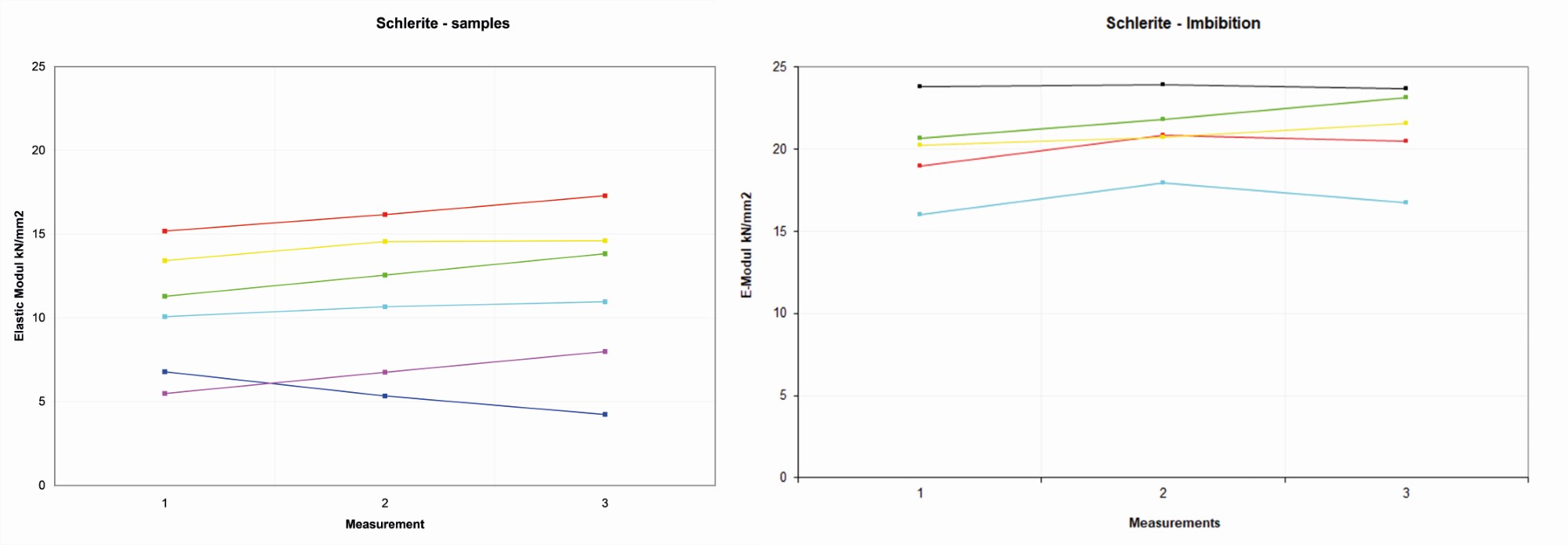 On the four Wurzeldorfer quartzite samples, the distribution of the reference values is more random, probably due to the major degree of compactness. The variation range is about 10 kN/ mm2 among 11-21 kN/mm2 (See Figure 6).