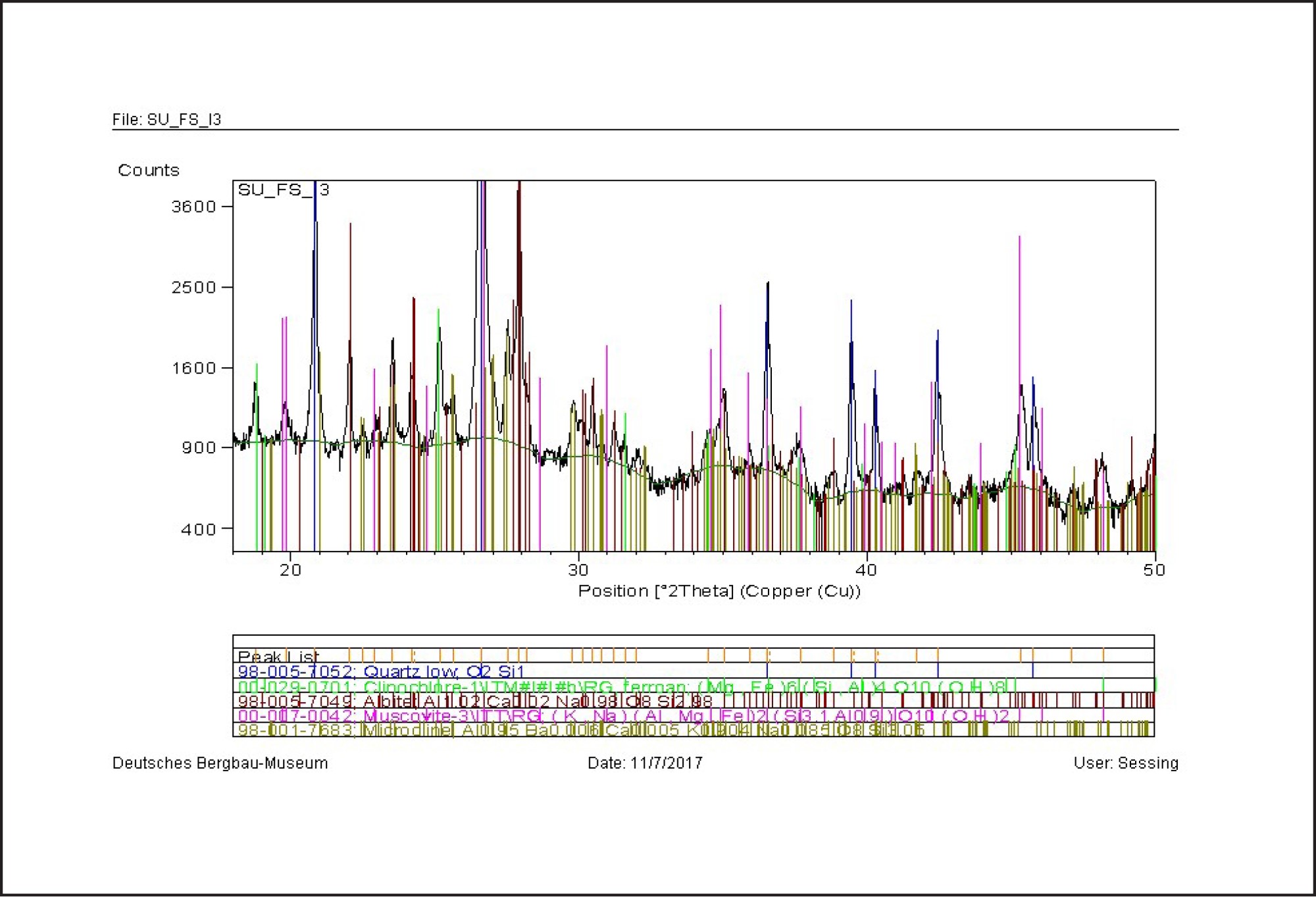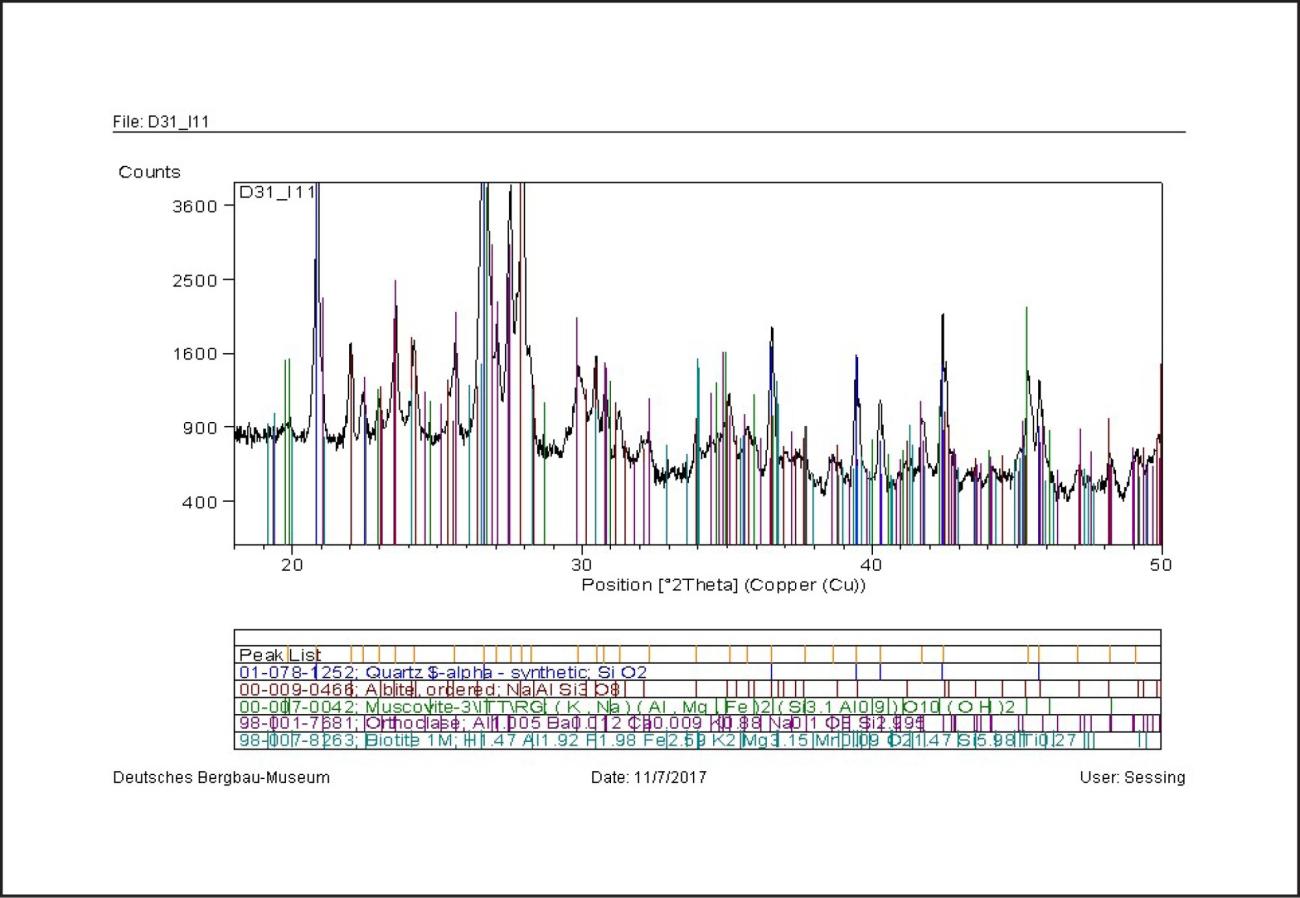 | Finally, the gneiss from Sankt Ulrich showed the phases of quartz, albite, muscovite and clinochlore and the fire-set sample likewise confirmed the major phases. | See Figures 38 and 39 |