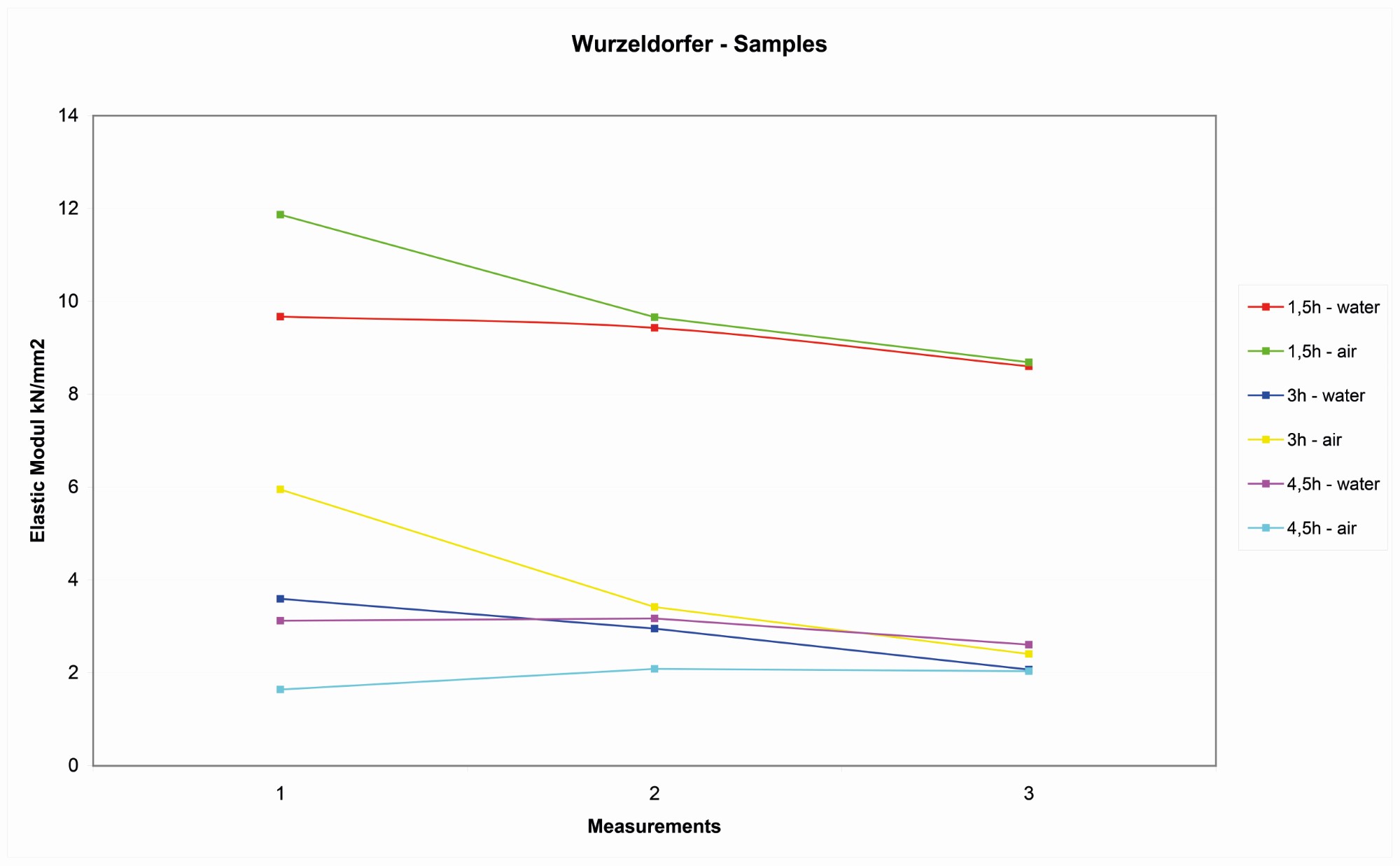 After the treatment the blocks show an abrupt decrease of elastic modulus, that starts to appear after one and a half hours with water quenching. Again, the sample quenched with water after three hours of treatment have values that are analogous to the samples treated for 4.5 hours (See Figure 11).