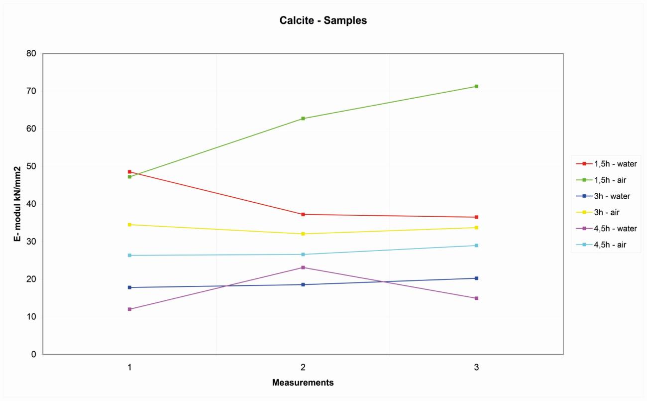 The graphs give interesting results concerning the trends of elasticity in these rocks, by showing a variable response to the presence of water. The elastic module decreases in relation to the temperature of fire-setting, without being unduly modified by water. That is a positive result in a way, as we can state that the portable protocol can be used in the field where the rocks are obviously impacted by rain and washout. Additionally, it is possible to see that, especially in the case of calcite, the range of variation of the elastic modulus increases extensively, while for the other type of rocks the effect seems less evident. In order to evaluate the power of the method and the problems that can arise in the field because of possible noise of signal, connected to peculiar types of rocks, it is useful to execute a comparison between the results obtained in the first set of experiments and the third (See Figures 25, 26, 27 and 28).