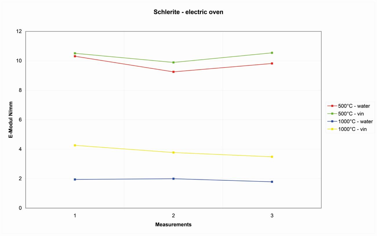 | Schleriter sandstone | In the case of schlerite, the elastic modulus decreases, as expected, with the increase of temperature of thermal treatment but there are no evident changes of cooling effects between the use of water and vinegar; indeed, it shows a slight increase in the elasticity of the rock at 500°C and a small decrease for the block treated at 1000°C (See Figure 17). |
