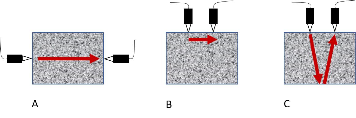 Reflection measurement (See Figure 2a), very often used in metal testing as a pulse-echo method, can only be used on sampled specimens. By using this positioning, it is possible to evaluate the inhomogeneities (aggregates, cracks), high sound absorption (porosity), and insufficient reflection horizons (uneven back wall).