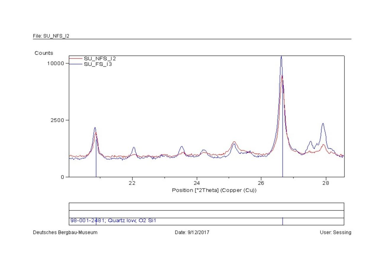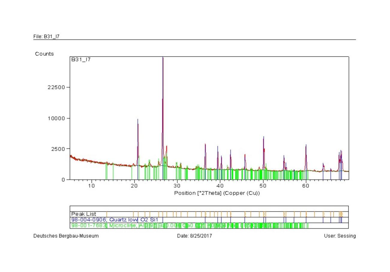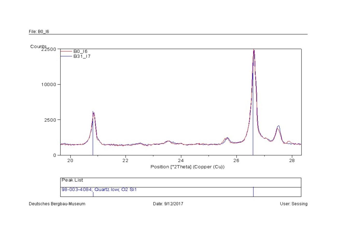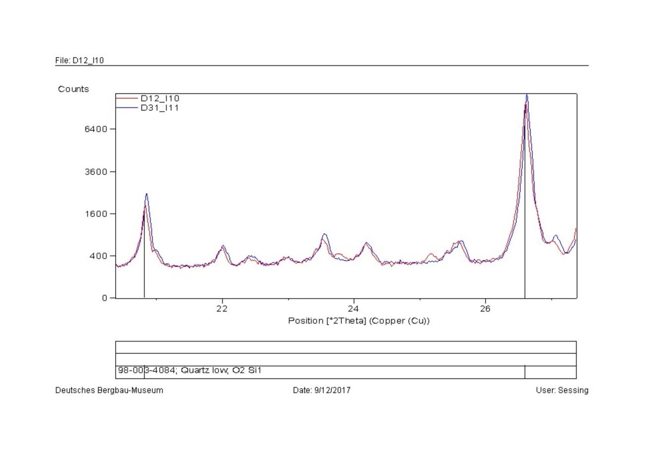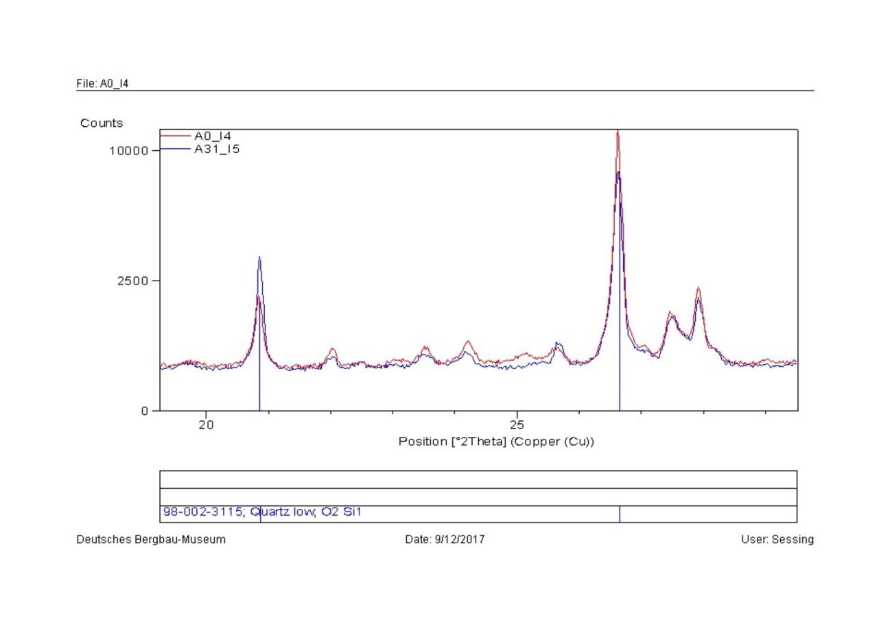 Only after the post-processing was done manually, with the interpretation of the minor peaks, by zooming the sector of the spectra between position 18 to 50 °2Î and zooming in the area of the low counts, some minor phases appeared. In sample A31 the peak at position 26° 2Î has a higher intensity than the references, suggesting a possible transition to the albite phase at high temperature (albite high, De Caro, et al. 2013). The peaks of quartz have an increase of volume and a shift to the right, that could be assigned to the transition to the beta phase. In the case of sample B31, the quartz seems slightly shifted to the right. The overlapping of the peaks of microcline and its high temperature phase orthoclase donât allow a detection of this possibly present minor phase. In the case of the calcite a minor peak appears at position 26° 2Î which can identify the presence of a minor phase of CaO that develops at over 900°C for calcination of CaCO3. All the other peaks of CaO are overlapping the peaks of calcite, causing a difficulty in distinction, but two shoulders of the peaks of calcite at positions 58 and 61° 2Î could be assigned to a minor presence of CaO. In sample D31, again the estimation of the presence of albite high can be determined by a slight increase in volume of the peaks from 22 to 26° 2Î of the spectrum and a peak at 27° 2Î. Again, the quartz seems bigger in volume and shifted to the right. In the sample of fire-set rock from Sankt Ulrich, the quartz shows an increase of volume and a shift (to the left this time), while in the area between 22-26° 2Î and 27-29° 2Î, the higher intensity of the peaks normally assigned to the albite could be interpreted as the additional minor phase of the high albite.
