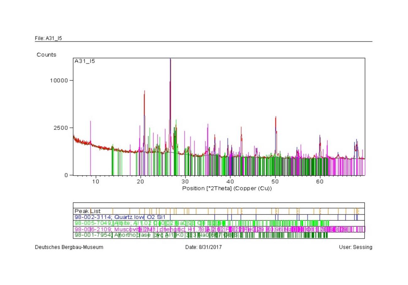 | Sample A0 is a sandstone composed of quartz, albite, muscovite, clinochlore and anorthoclase and A31 analogously showed the same phases, with the sole absence of the clinochlore. | See Figures 31 and 32 |
