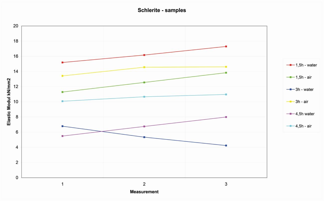 The variation of elastic modulus was, in the unheated schlerite, due to the heterogeneities of the rock, in a range between 16.4 and 20.2 kN/mm2.