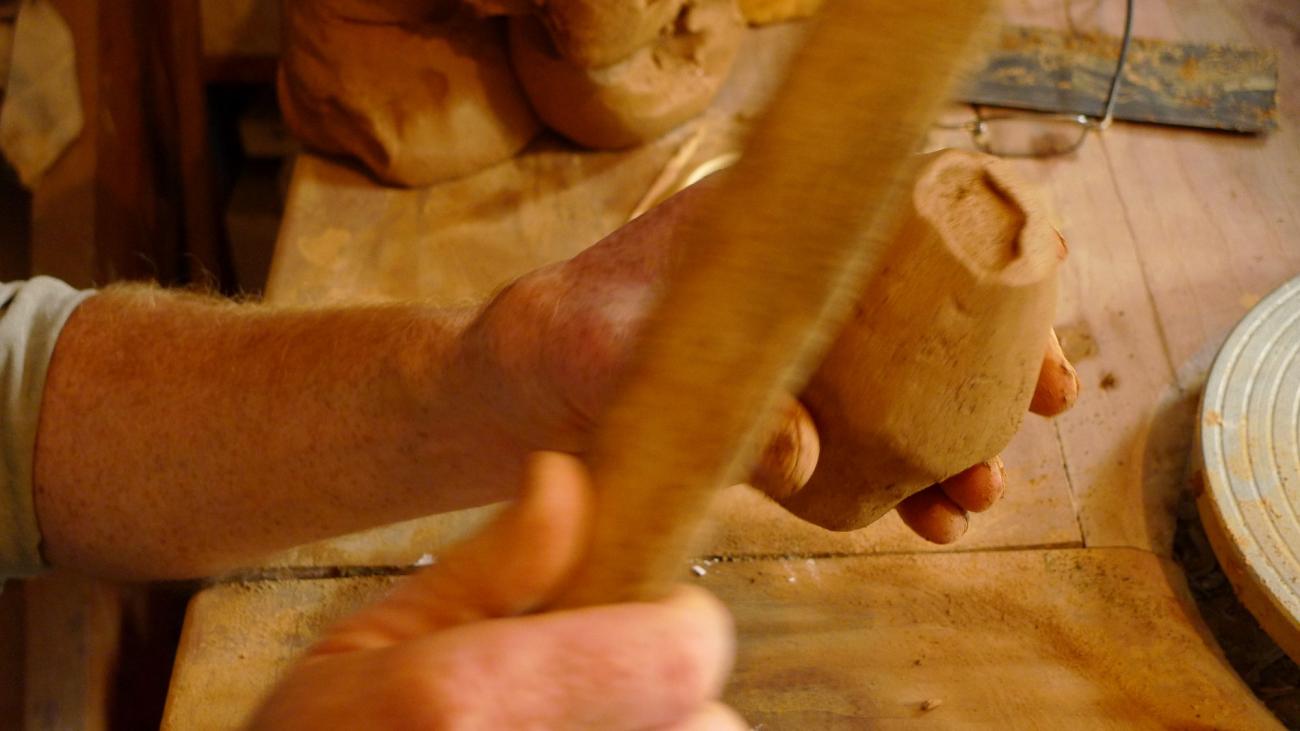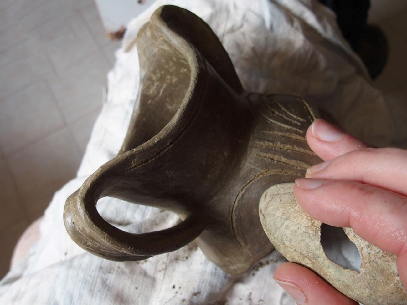 - Modelling of the vessel. Small vessels, such as the beakers of the Vatin culture, are made from clay balls. At the beginning of this process, the bottom of the vessel was formed by a circular movement of a hand (See Figure 3). Having reached basic a height, the vessel was roughly made with thicker walls. This was followed by gradual thinning of the inner walls by fingers or tools to form the upper part of the vessel. Finally, the surface was evened using fingers, stone, bone tool and/or wet wool. Handles were then made of clay bands, which were already decorated by hand. They were attached to the surface of the vessel (See Figure 4). This produced a large contact surface enabling better adhesion of the handle to the vessel. Contact placement can be evened out using water, fingers or wool. Additionally, the surface had been evened by manipulation using a rib of a large mammal, while the vessel was rotating (See Figure 5).
