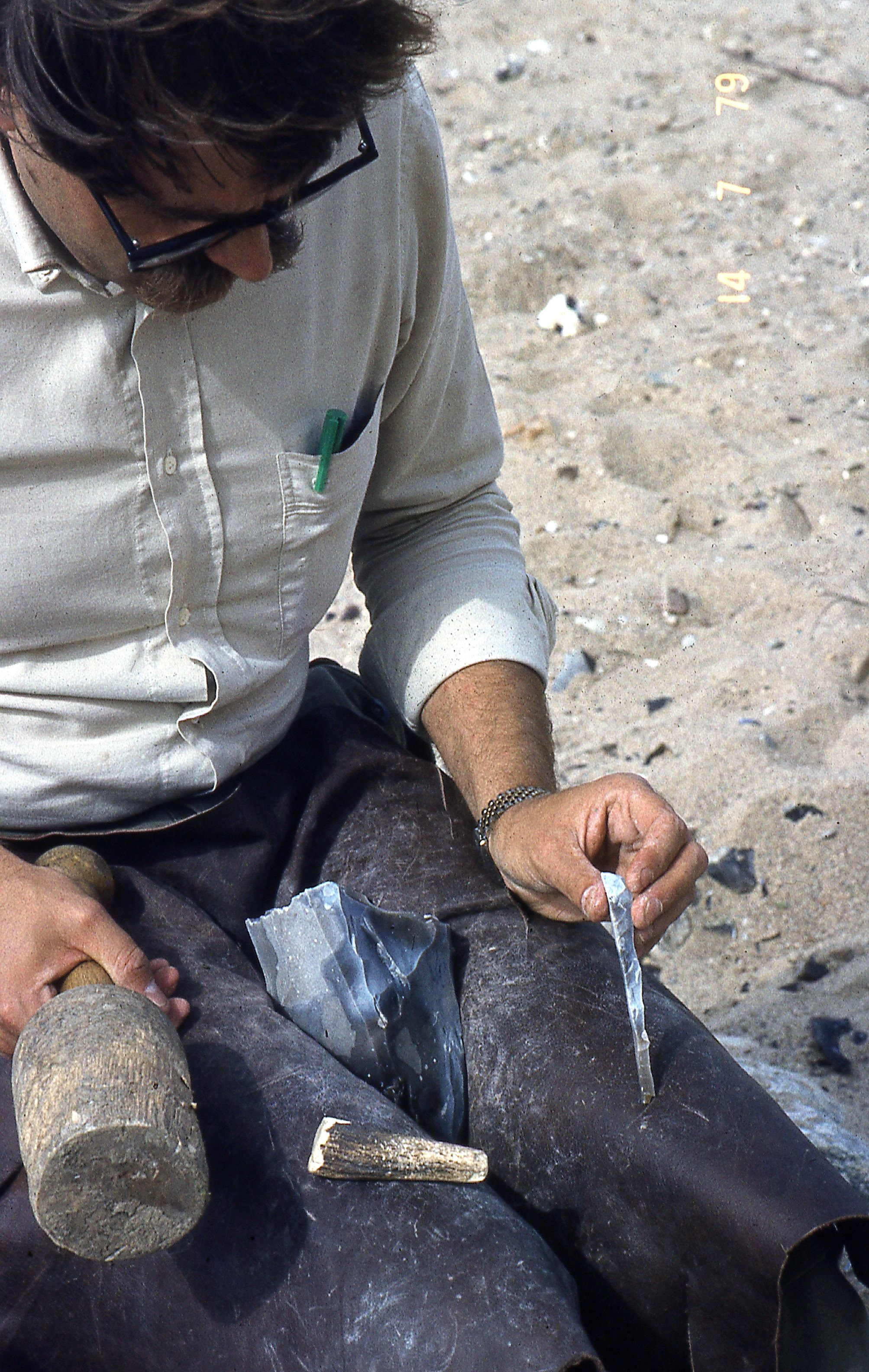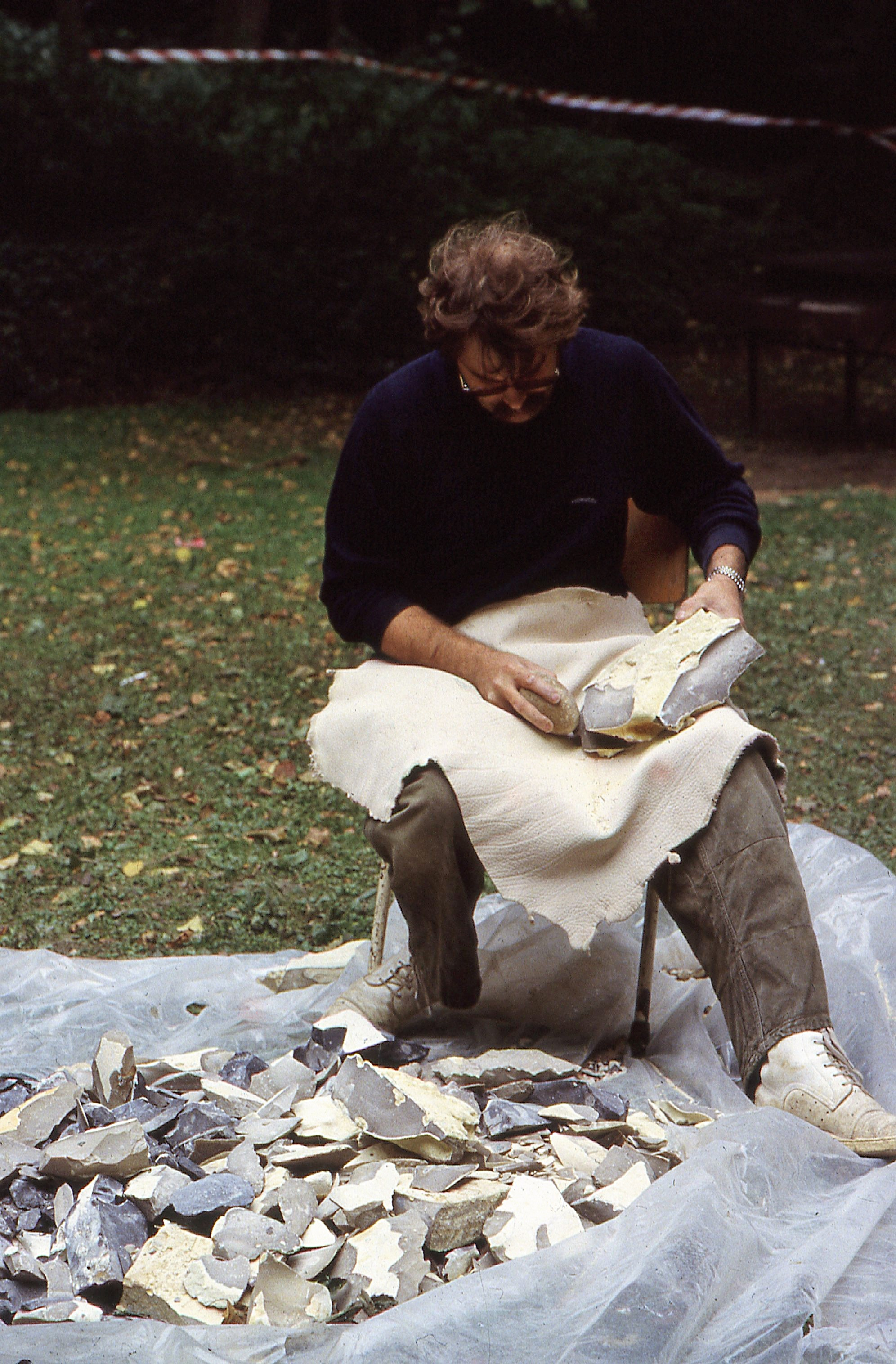 I was the first German archaeologist who was invited to the second international symposium of lithic technology in Lejre in 1981, and I´m still proud of it. In October 1980 we had invited Marc Newcomer and Bo Madsen to the opening of the exhibition “5000 years Flintmining” in the German Mining Museum (DBM) in Bochum, where they demonstrated flintknapping, and the invitation to Denmark was caused by Bo. There I acquainted Errett Callahan, Jaques Pelegrin, Debby Olausson, Thomas Johansson and Peter Kelterborn, and I met Anders Fischer, Hans de Haas, Ivan Andersen and Thorbjørn Pedersen, too. On the last day an unknown flintknapper appeared with an open backpack, inside stuck a long item wrapped in a blanket. He gave a strong pull at it, and out came a 60 cm long, entirely ground four-sided flint axe blade, which he had made – spectacular!