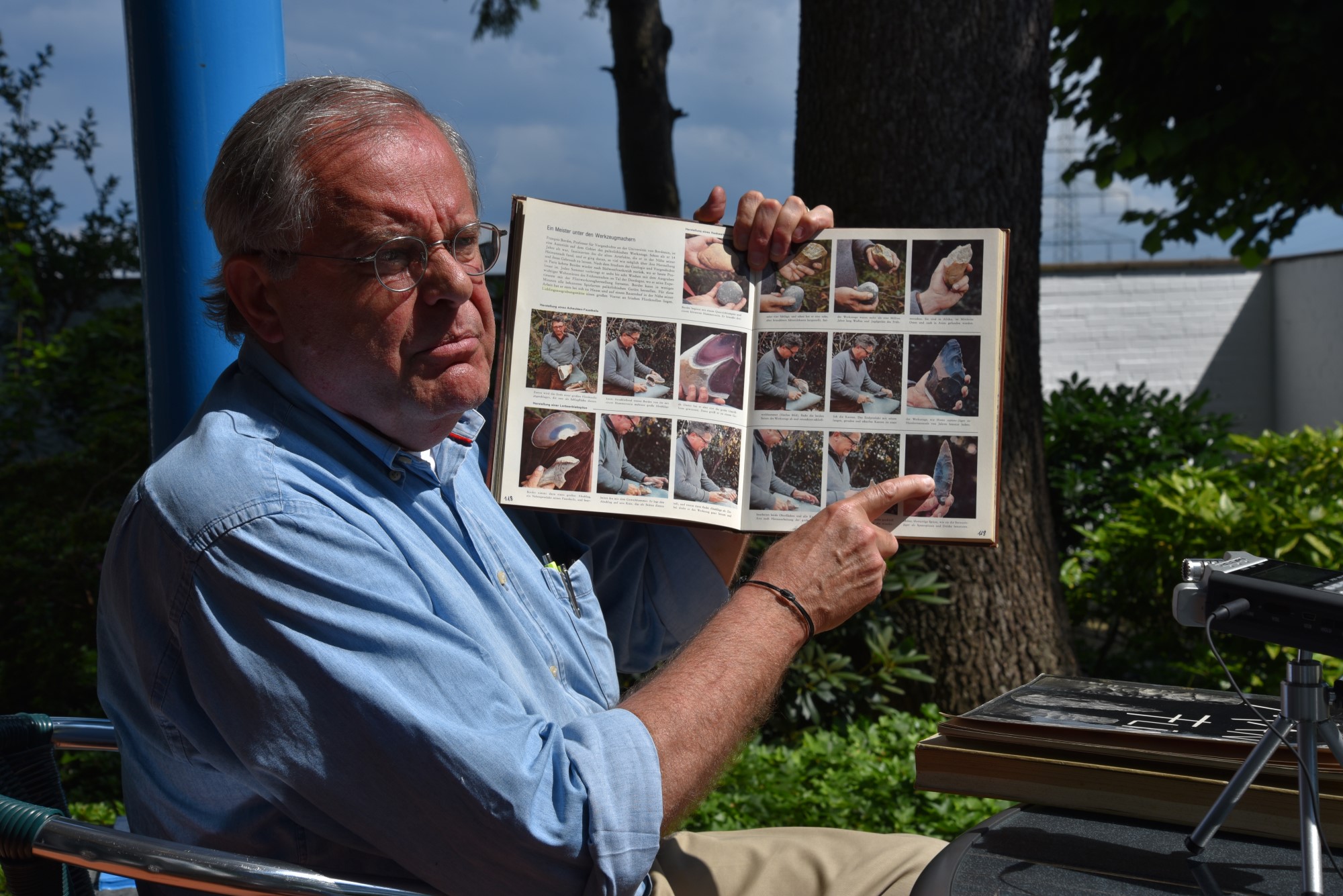 Jürgen Weiner - you can’t get away with not knowing this name if you are involved in Experimental Archaeology, even more if it involves flint. Weiner has published numerous works and he is known as a walking encyclopaedia. Along with Marquardt Lund, I met Jürgen and his charming wife in their house near Cologne. Our interview took place on a pleasant June afternoon in the garden, later shifting into the kitchen; Jürgen is an excellent cook and prepared a bean stew „tavče prebranac“. We subsequently moved down into the basement, where we were captivated by his library, workspace and collection. We finally ended our conversation in the early hours of the following morning, in the living room. Jürgen´s stories are as spicy as the dinner, embellished with anecdotes, all of which I cannot render here. Moreover, he turns out to be an exceptional entertainer, time and again falling skilfully into every possible dialect and more than once matchlessly imitating certain luminaries of archaeology – we laughed a lot throughout the evening.