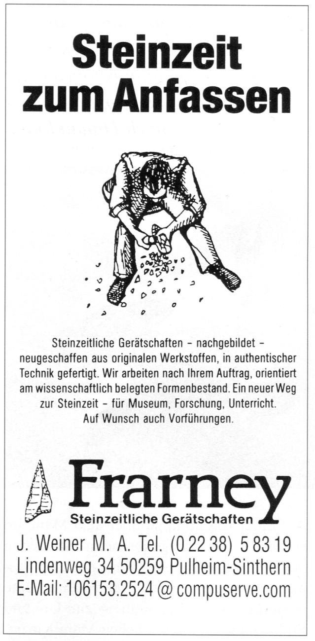 Yes, from a fiscal point of view, as a tax consultant told me once … The first advertisement of “Frarney – Stone Age utensils” showed up in “Archäologie in Deutschland” (German archaeology magazine) issue 2/1988, last in issue 1/1998. Ten years company of my own! Of course with permission for spare-time work from my employer and income properly taxed.