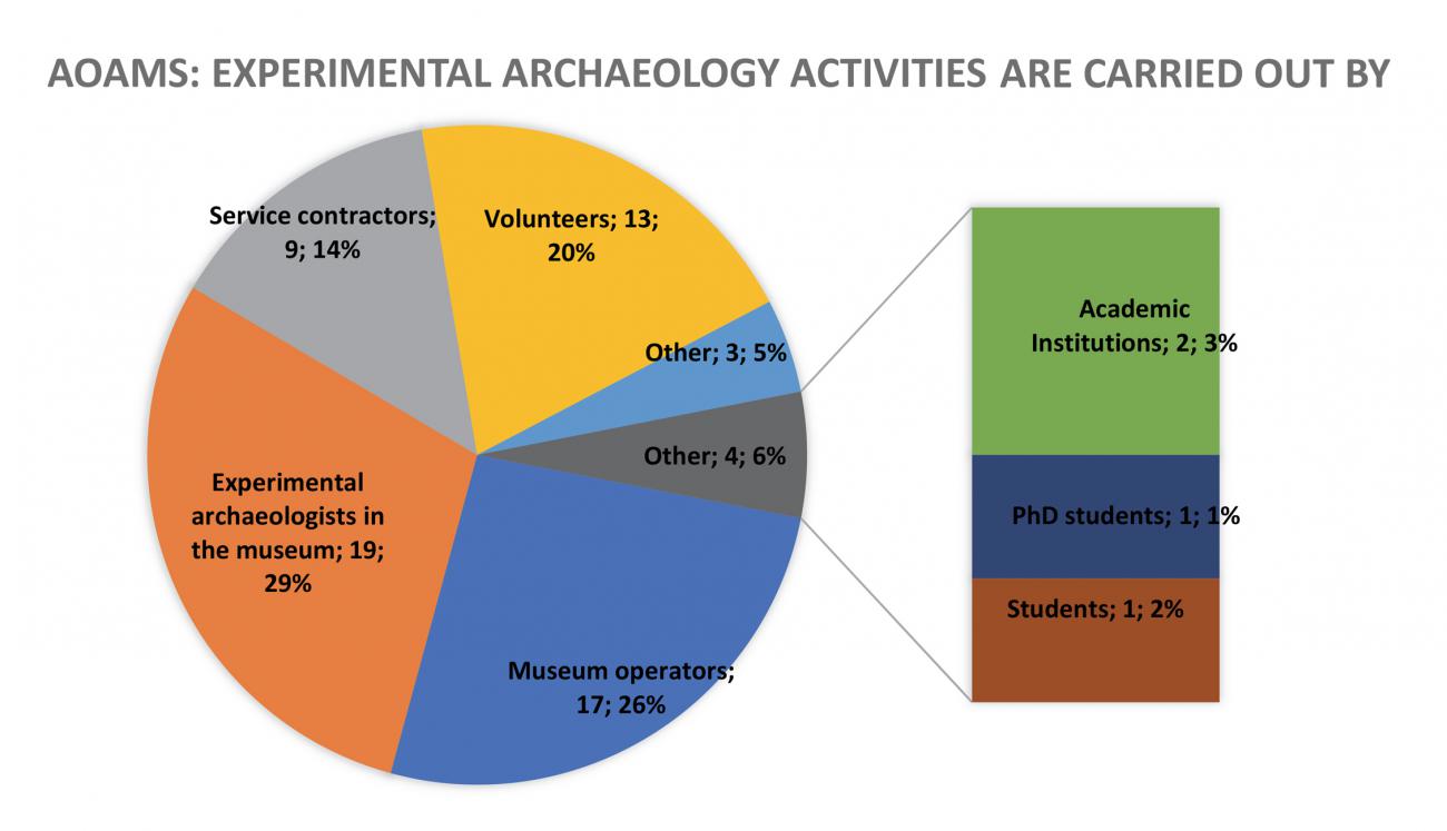 The term “independent activities” refers to the subjects involved in “experimental archaeology activities” who gravitate around the institutional poles of AOAMs and Academia. This definition was kept very broad to include the entire range of commitment, from the occasional volunteer to the freelance professional. As well as contributing in mapping the realities involved in this dynamic, this inquiry had the scope to determine the Human Resources (HR) characteristics and their contractual position. The focusing on HR was felt important as it could help in tracing best practices not only in the “research performance” through experimental archaeology, but also from a job market perspective.